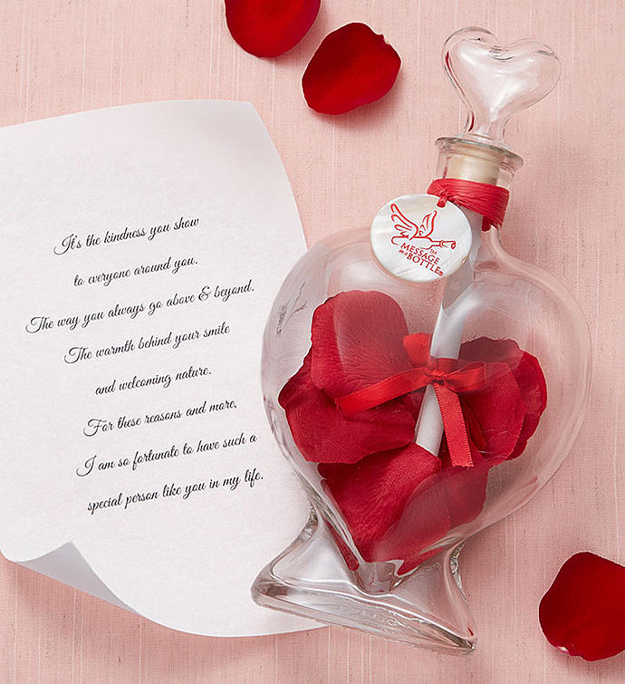 Exclusive Message in a Bottle® features a heart-shaped glass keepsake bottle; inside is a message scroll that reads: “It’s the kindness you show to everyone around you. The way you always go above & beyond. The warmth behind your smile and welcoming nature. For these reasons and more, I am so fortunate to have such a special person like you in my life.”