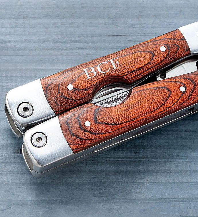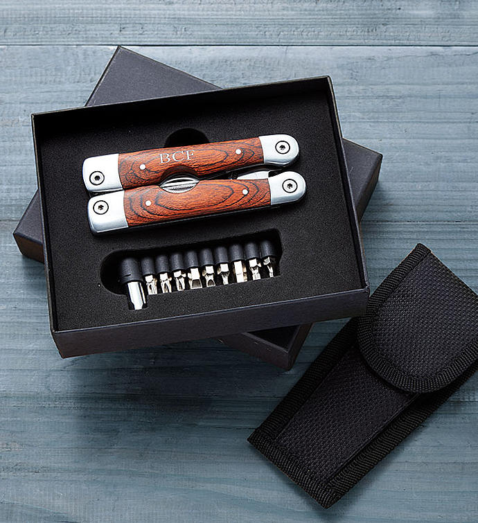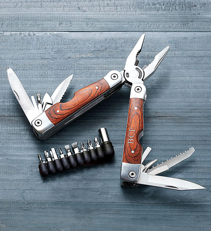 This is the one tool to have handy when just about anything needs fixing. Our unique hinged multi-function tool features genuine wood inlaid handles—and inside he’ll find knife blades, a bottle opener, a saw blade, a file, Phillips and slotted-head screwdrivers, and a driver for the additional 9 screw bits (plus driver adapter) included in a rubberized holder. Plus, the whole tool opens to become a 7" pair of pliers! A durable black cloth pouch holds the device neatly and can be worn on a belt. Make his gift extra special by adding a personalized monogram.