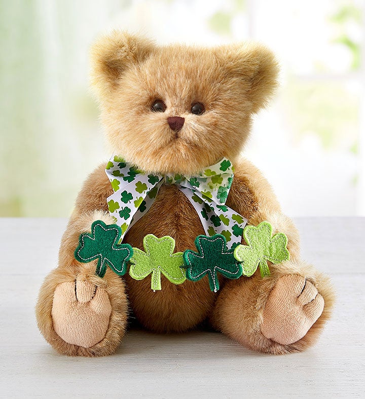 · Bearington “Paddy” plush teddy bear carries a green shamrock banner and wears a matching shamrock ribbon