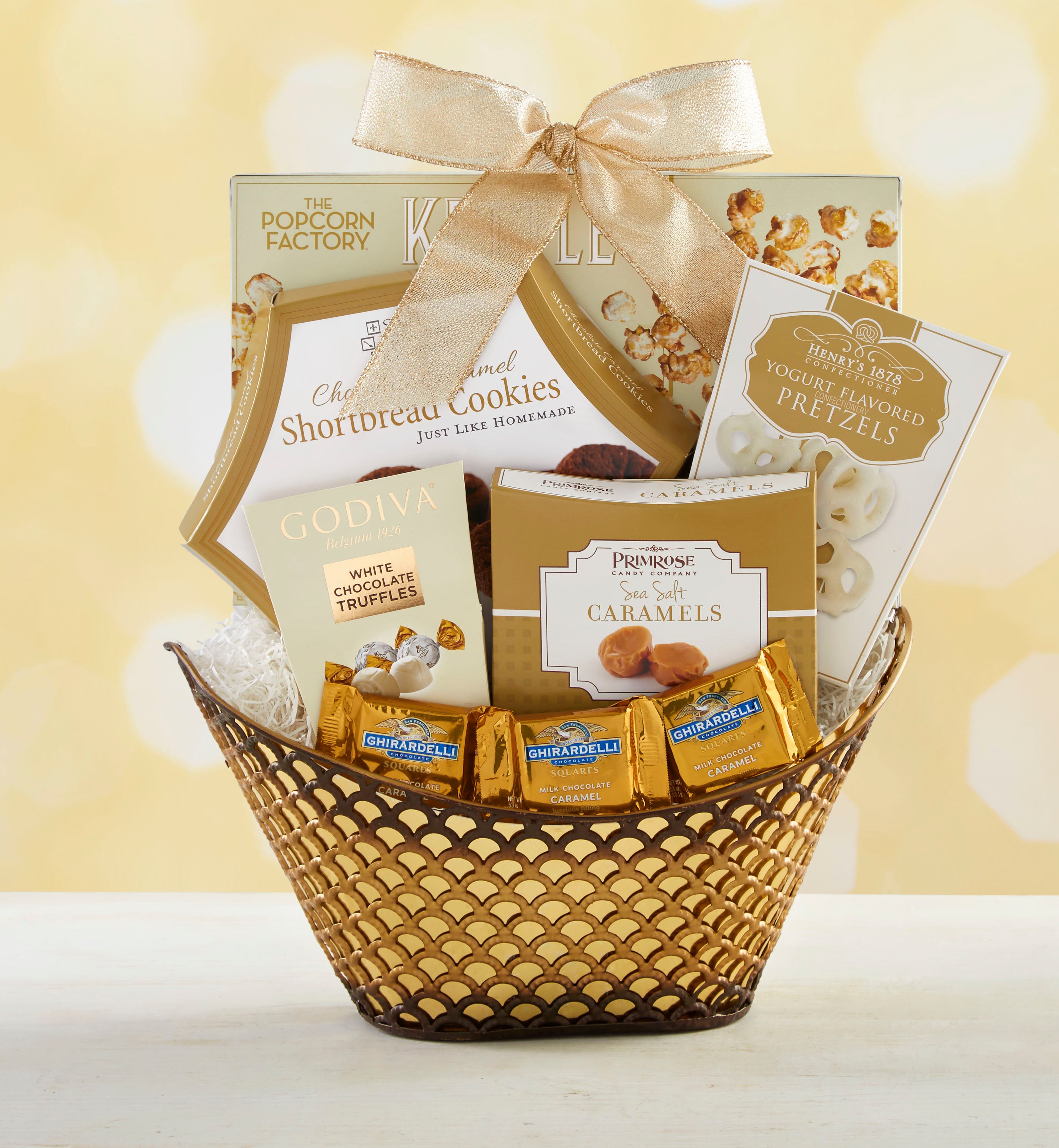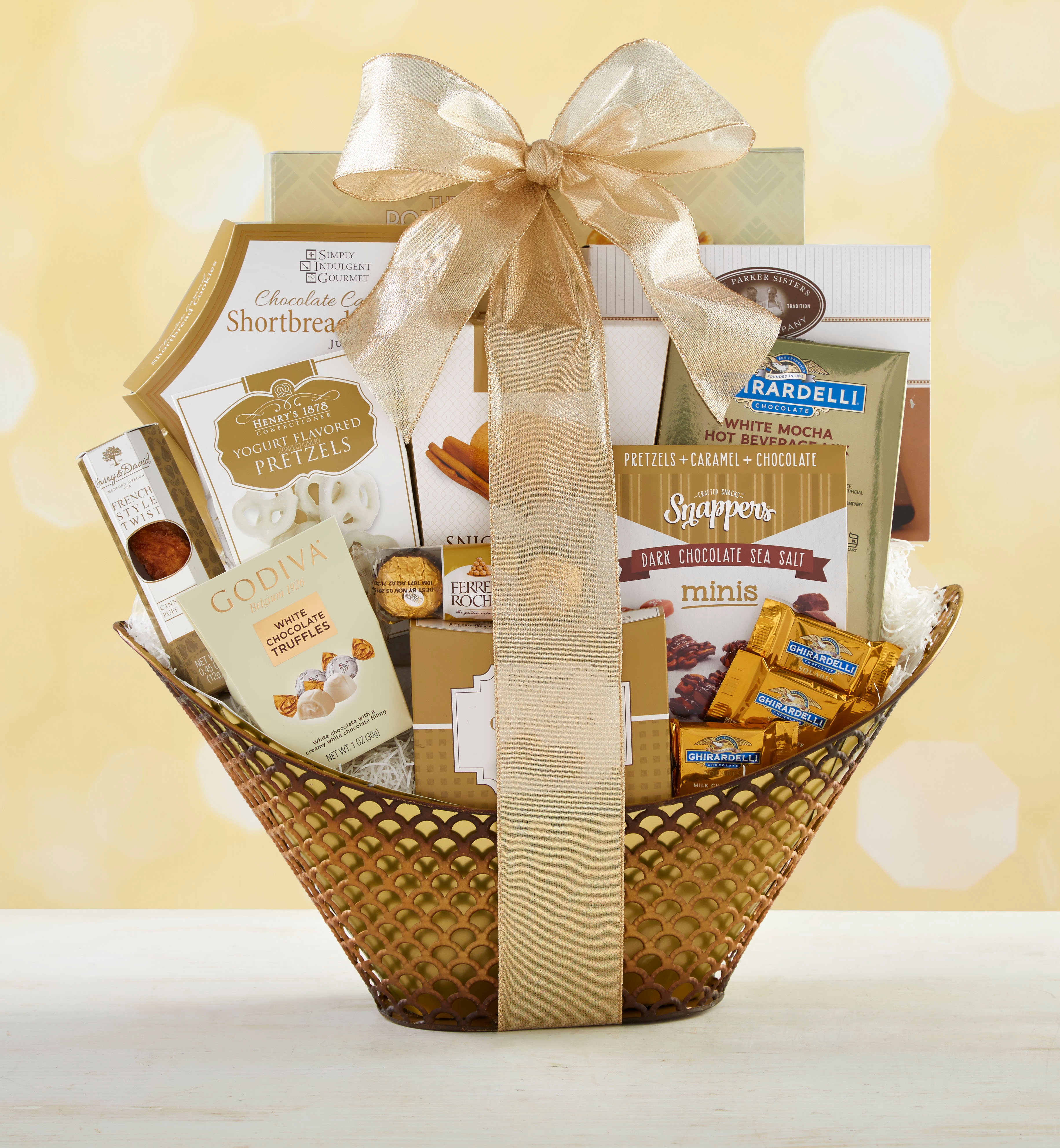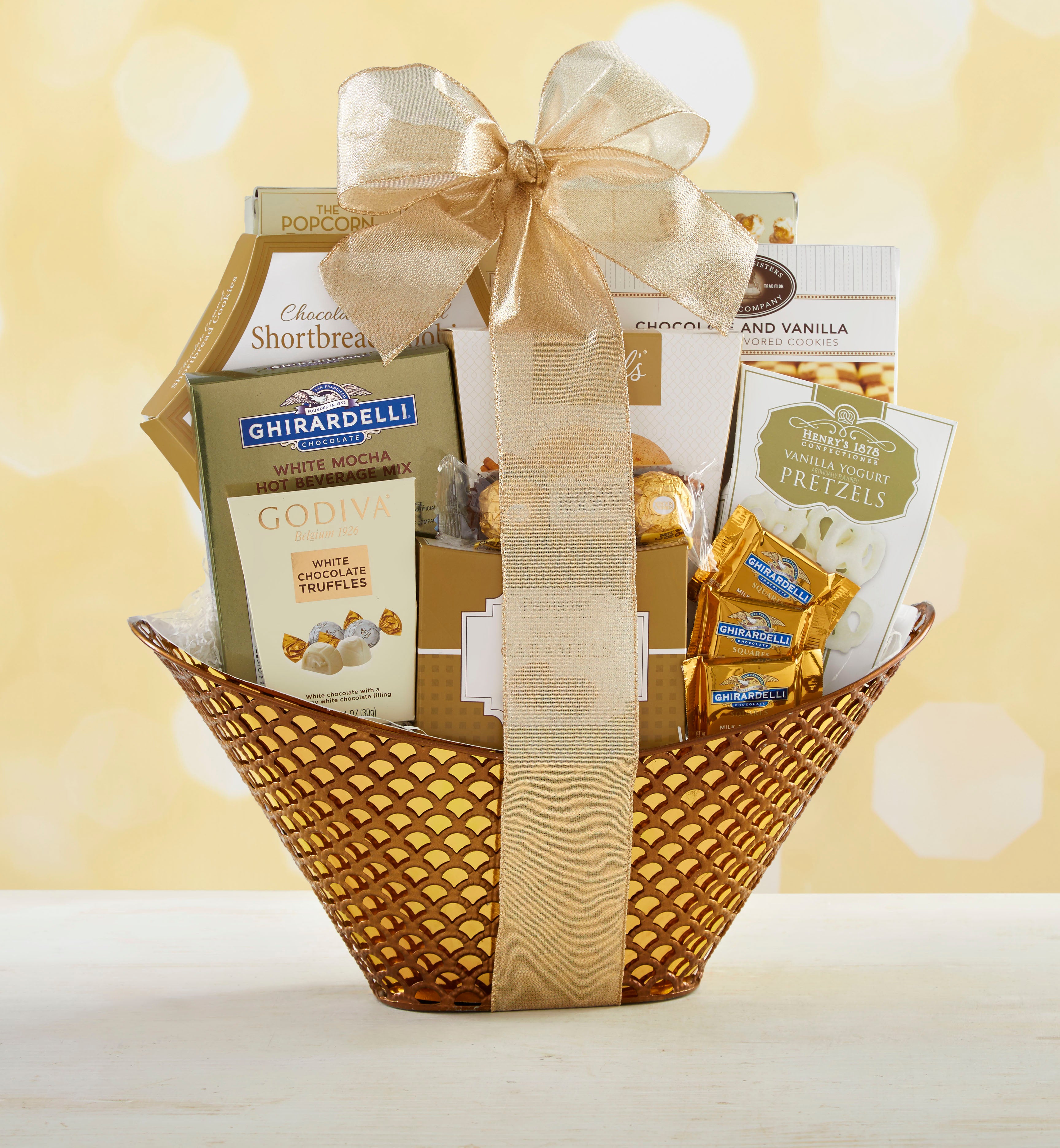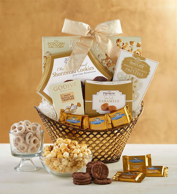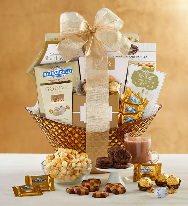 From the sophisticated gold basket to the extravagant treats inside, this gift will thrill anyone who dreams of chocolate. They’ll love the assortment of delicacies like Godiva® Chocolates, Ferrero Rocher® Gold Wrapped Chocolates, Ghirardelli® Squares® Milk & Caramel Chocolates and more!