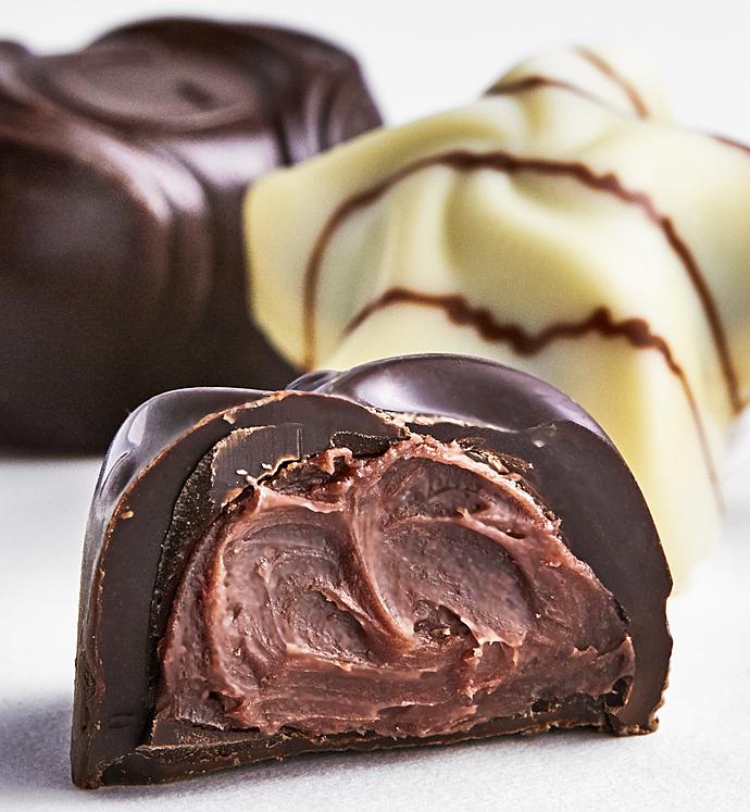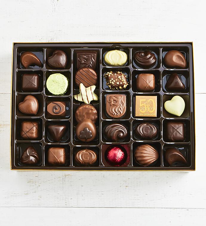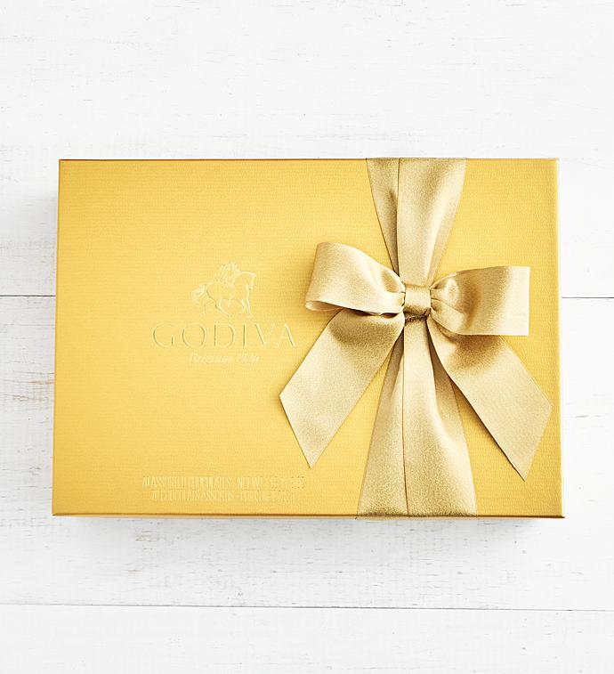 Make the ultimate good impression when you send this 70 piece assortment of the finest that Godiva has to offer! This opulent and iconic gold ballotin gift box is filled with Godiva's top products including Cinnamon Blush, Coffee Feather, and Milk Ganache Bliss chocolates.
