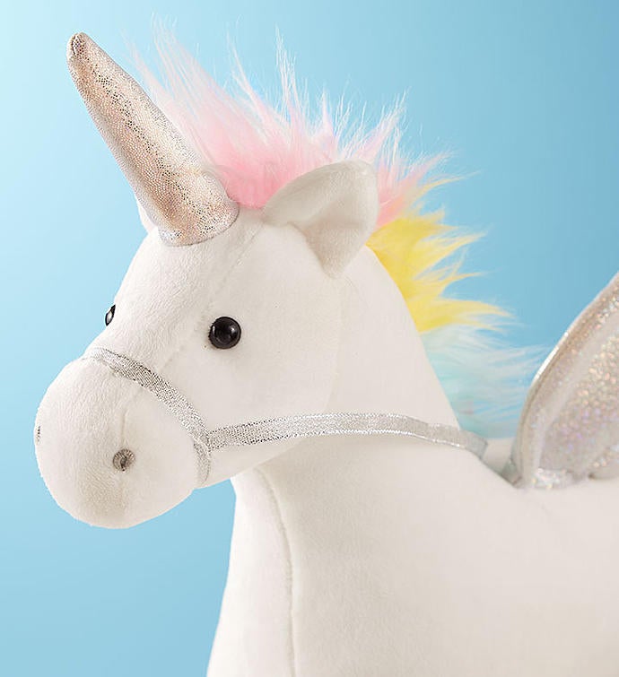 A magical day is just a fairytale unicorn away! Our mythical GUND® plush features a brilliant rainbow mane and tail, sparkling wings and accents. Pet its mane to produce a twinkling sound effect and watch its wings light up in dazzling display. We’ve even paired it with a delicious unicorn sugar cookie to make all their unicorn dreams come true.