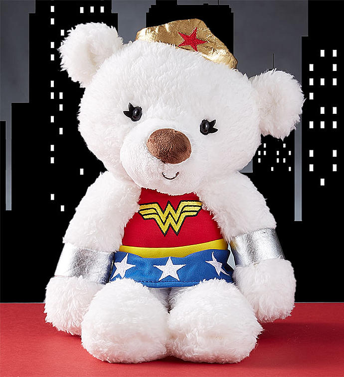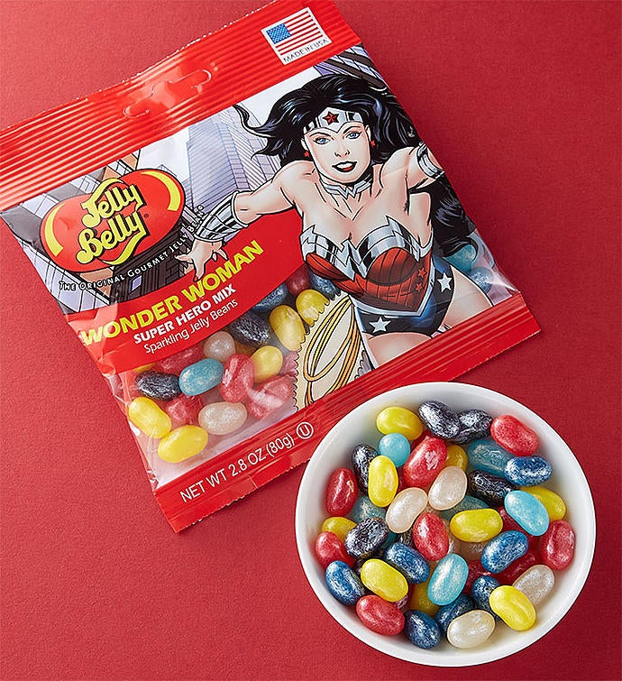 Even teddy bears dream of being super heroes. Our adorable, classic Gund bear is dressed up in a red Wonder Woman suit & crown and is sure to delight comic book fans of all ages. And as if a bear in a Wonder Woman costume wasn’t wonderful enough, we’ve paired her with a bag of delicious Jelly Belly jelly beans in a rainbow of super flavors!