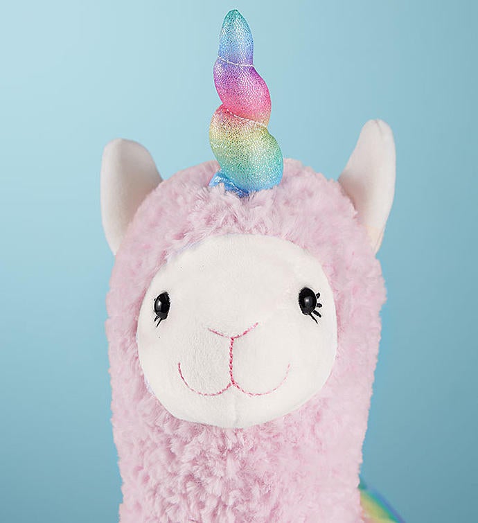 The mythical GUND Llamacorn has arrived in a flurry of sparkle and shine! With a pink smile and long llama lashes that lend its sweet expression, our part-llama part-unicorn ultra-soft plush features wavy-textured pink fur, soft iridescent wings, and of course a twisty rainbow-colored horn. Truly unique and right on trend, it’s an enchanting gift for all ages.