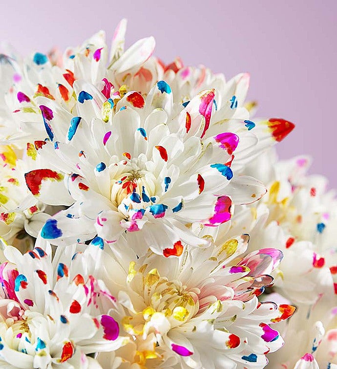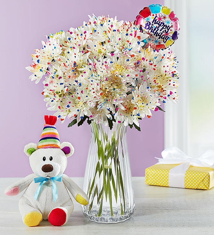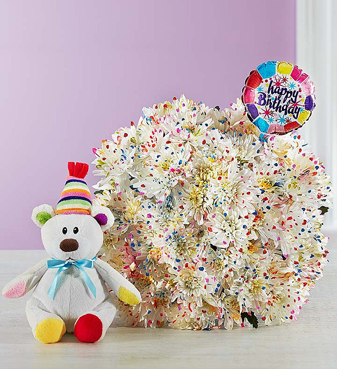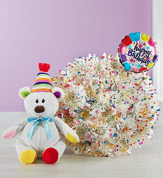 These are no ordinary flowers, but blooms that have been artistically splatter-painted in a rainbow of colors to make someone’s birthday unforgettable! For even brighter smiles, we’ve paired our truly original bouquet with our adorable plush party bear and “Happy Birthday” balloon.