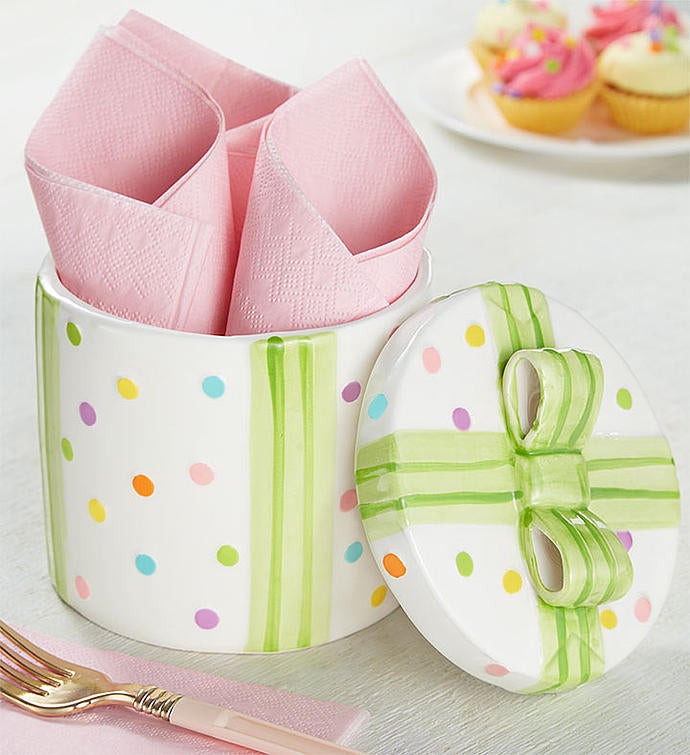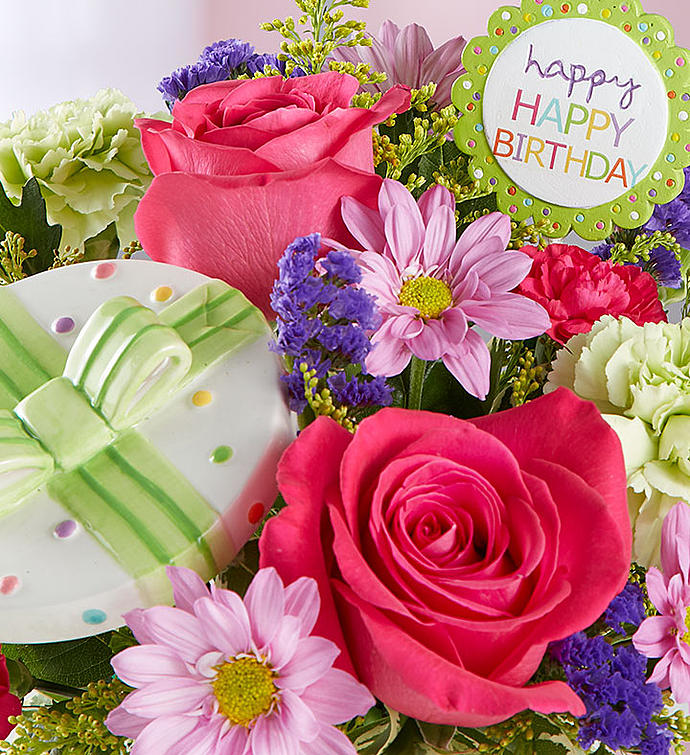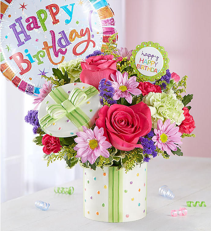 EXCLUSIVE Send a birthday surprise that’s bursting with color and celebration. A vibrant mix of blooms arrives in our exclusive ceramic container by artist, Sandra Magsamen, designed to look like a festively wrapped present. Painted with happy polka-dots and a colorful bow, it’s just the gift to brighten their day.