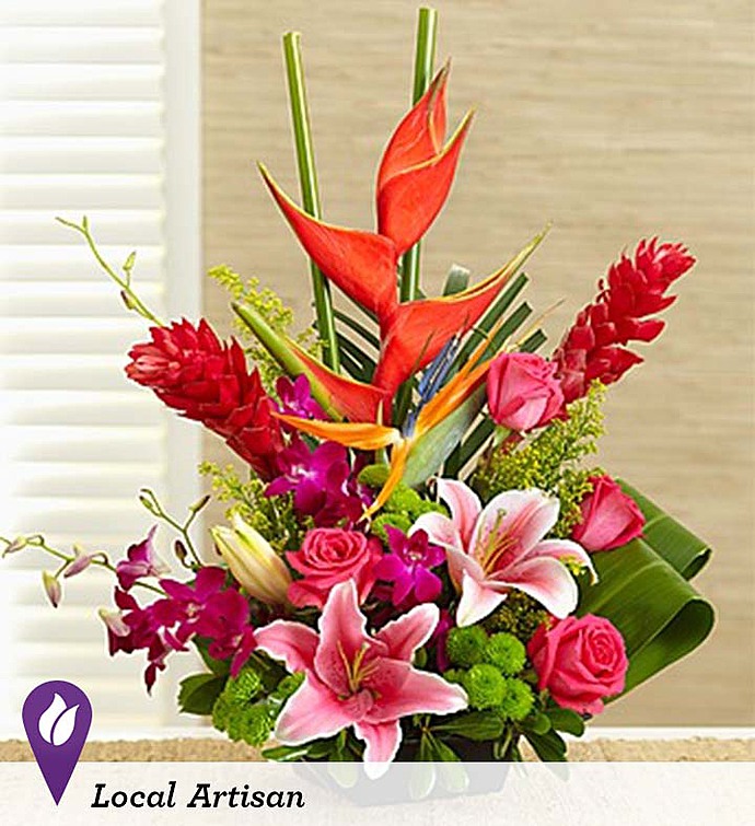 LOCAL ARTISAN When floral designer Yunus arrived at his hotel during a recent trip to Hawaii, he was greeted by beautiful floral arrangements featuring Stargazer lilies and ginger. He was also thrilled to see Stargazers—his favorite flower—showcased in the hair of the local hula dancers. To bring this unforgettable experience home, he's created a truly original arrangement of Stargazer lilies, Dendrobium orchids, ginger, heliconia, and more, gathered fresh to deliver a little piece of paradise to their day.