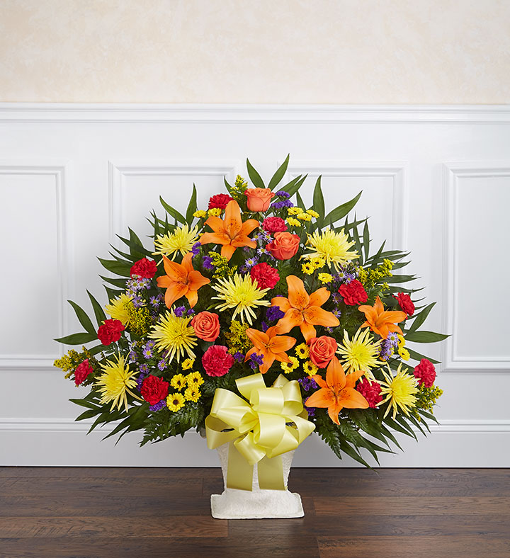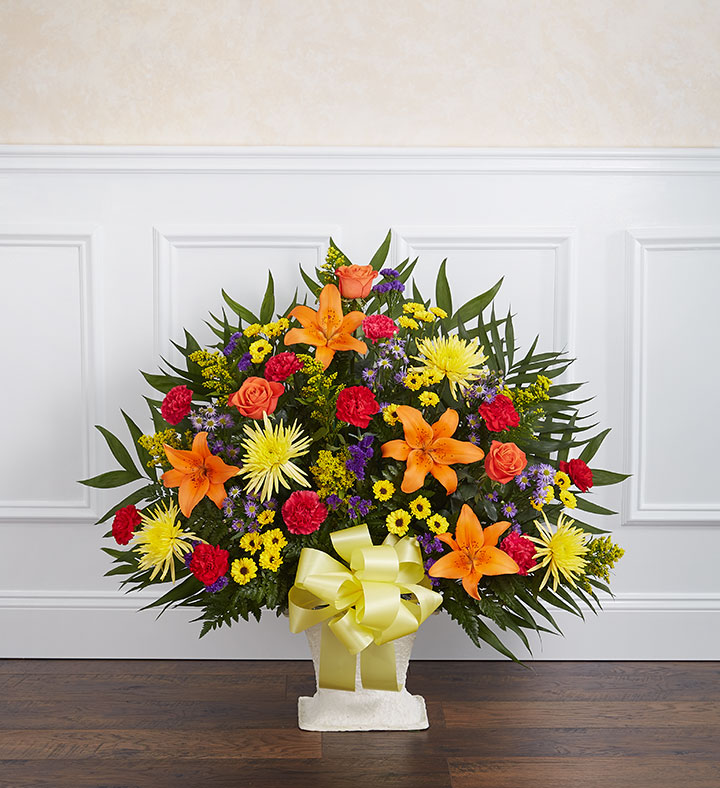 Honor a vibrant spirit with a bright, beautiful tribute. Our elegant floor basket arrangement in vivid hues, handcrafted by our caring florists with lush, colorful blooms, is a tasteful gesture perfectly suited for the funeral home or memorial services.
