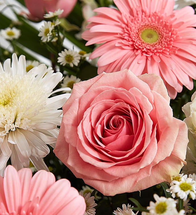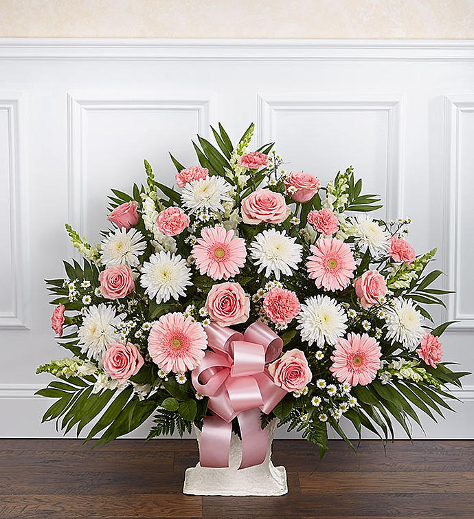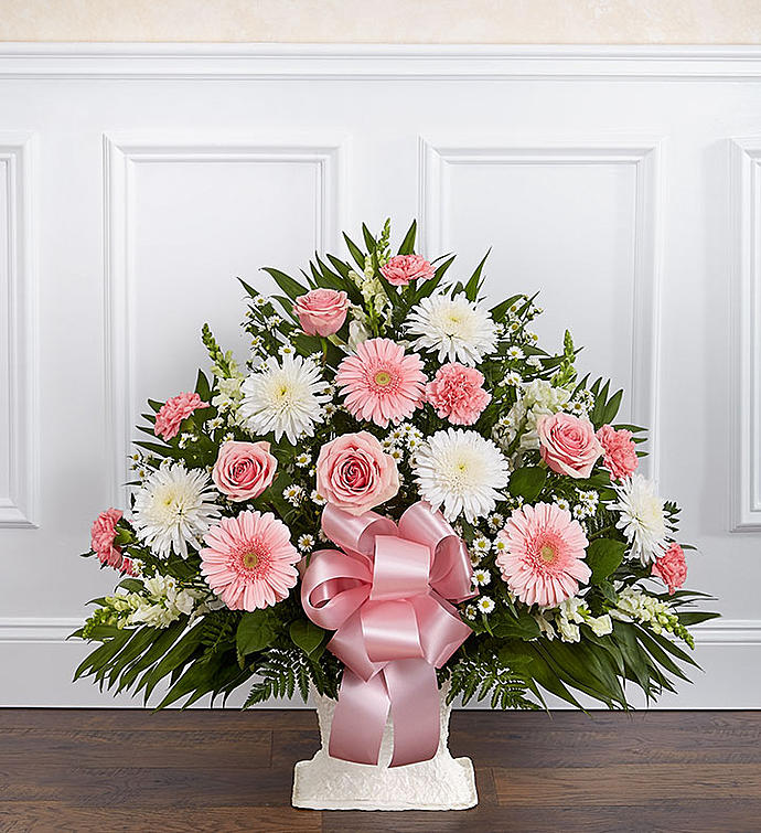 A heartfelt expression in their time of grieving will let them know you are remembering and honoring the departed. Our elegant floor basket arrangement in calming hues, handcrafted by our expert florists with lovely pink and white blooms, is a tasteful gesture perfectly suited for the funeral home or memorial services.