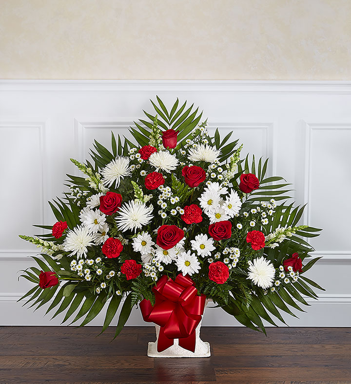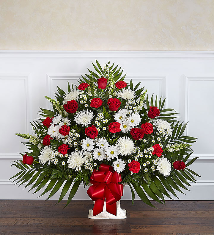 Majestic red and white blooms symbolize a special tribute of heartfelt love and adoration. Our elegant floor basket arrangement, handcrafted by our expert florists with radiant red and white blooms, is a tasteful gesture perfectly suited for the funeral home or memorial services.