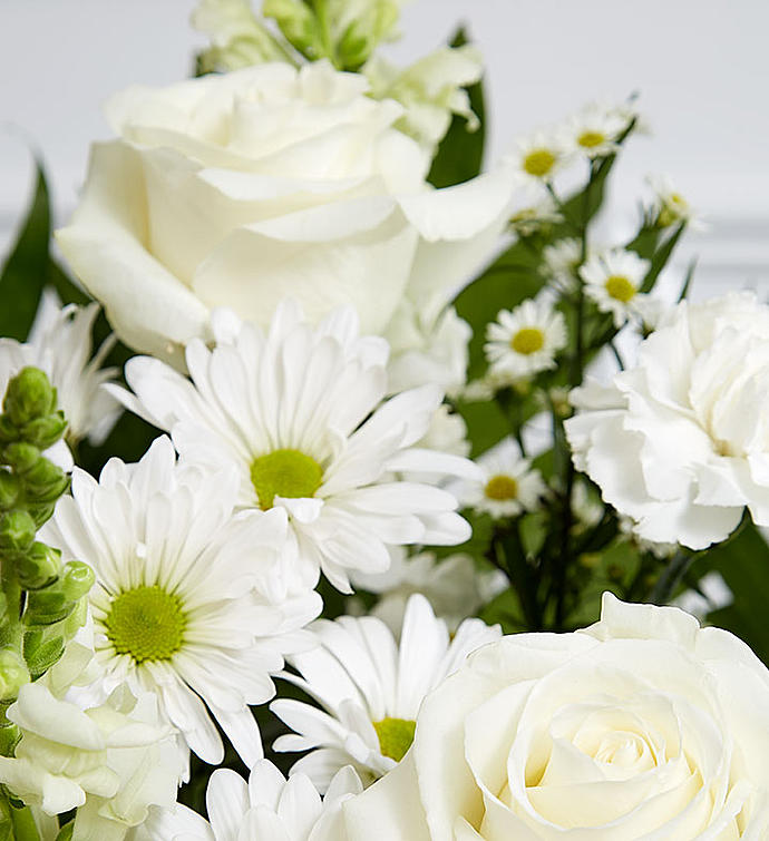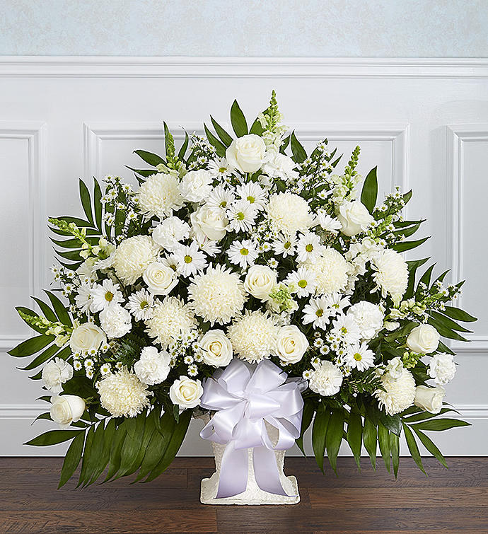 There’s a feeling of peace and tranquility that white flowers can bring to those who are grieving. Our elegant all-white floor basket, handcrafted by our caring florists with lush white blooms, is a tasteful gesture perfectly suited for the funeral home or memorial services.