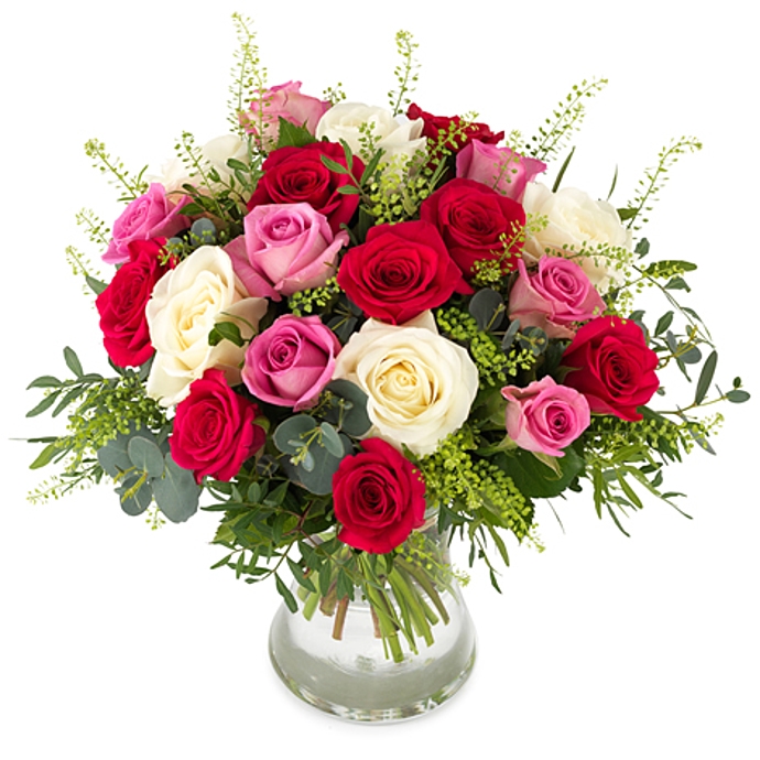 A bouquet that oozes character, optimism and love. Roses in beautiful colours - the ultimate choice whatever the occasion. **The vase is not included.**