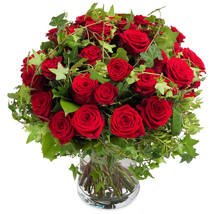 "This eye-catching red rose bouquet kicks it up a notch with long tendrils of ivy wrapped in a tender embrace. NOTE: This image shows an example bouquet. There is no specified number of flowers. The florist will bind the bunch according to season and region."