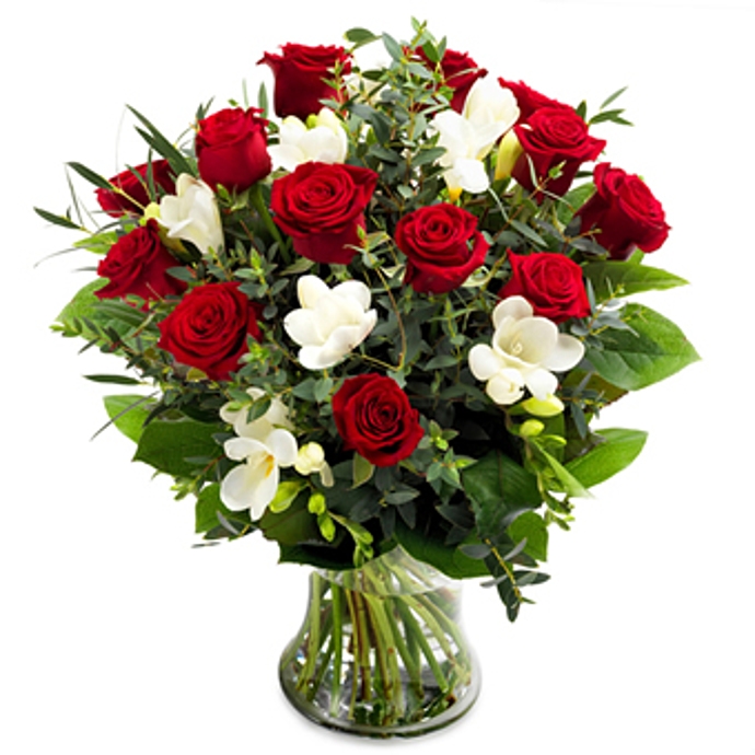 A classically inspired bouquet of red roses contrasted by bright white blooms and diverse greenery! **The vase is not included.**