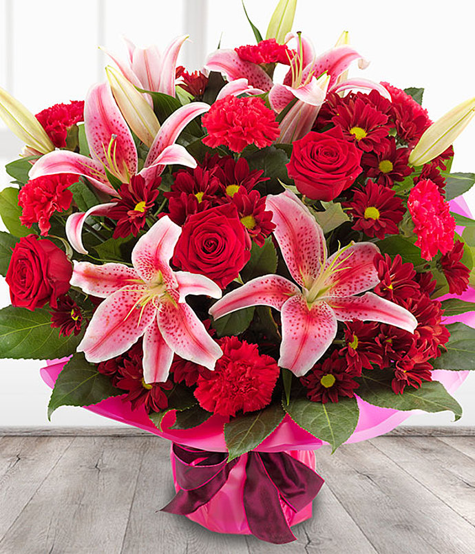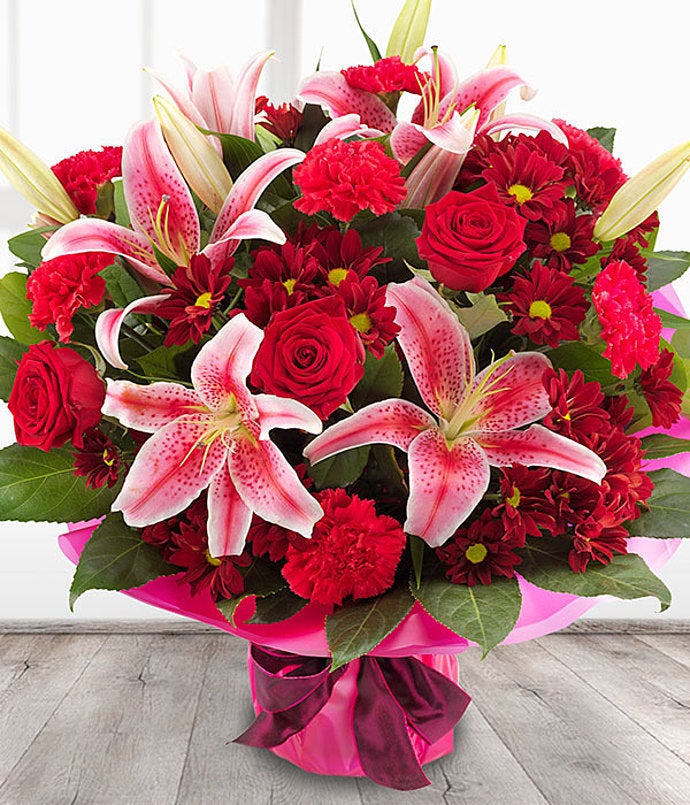 An incredibly romantic and simply stunning rich red Rose & pink Lily flower bouquet with deep red Spray Chrysanthemums and bold Carnation blooms.