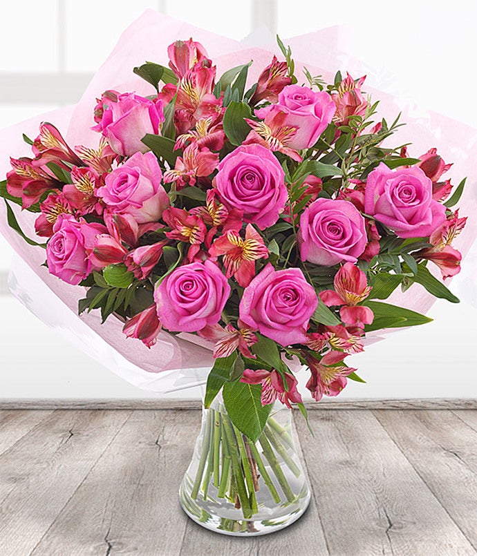 Luscious pink Roses and pink Alstroemeria presented beautifully in a bouquet with a dash of Ruscus and Pistache. Delivered by Courier. Flowers will be delivered in bud for freshness.