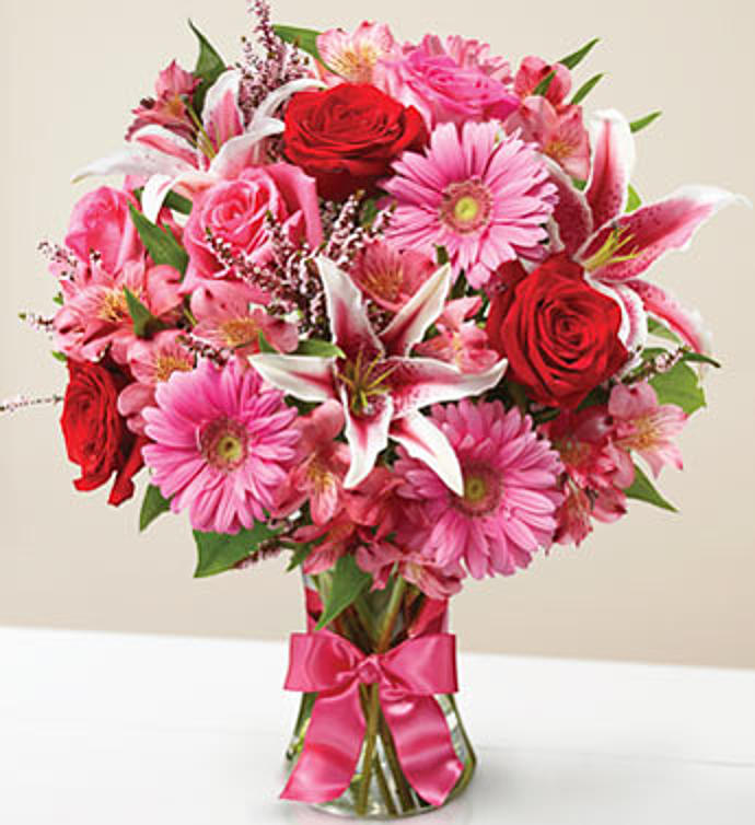 This gorgeous bright l arrangement is sure to turn any day into a wonderful one. With gorgeous red and pink roses, lilies, Gerbera daisies and alstroemeria, this "field-gathered" is a romantic taste of an old-world tradition.