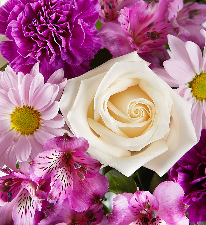 • Gathering of white roses, lavender daisy poms, Peruvian lilies (alstroemeria) and lavender carnations; shades of lavender may vary