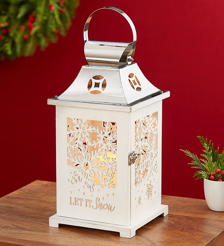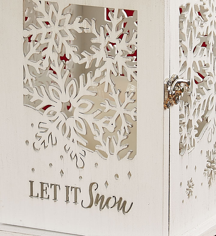 - Wood with laser-cut “Let It Snow” and cut-out snowflake design
