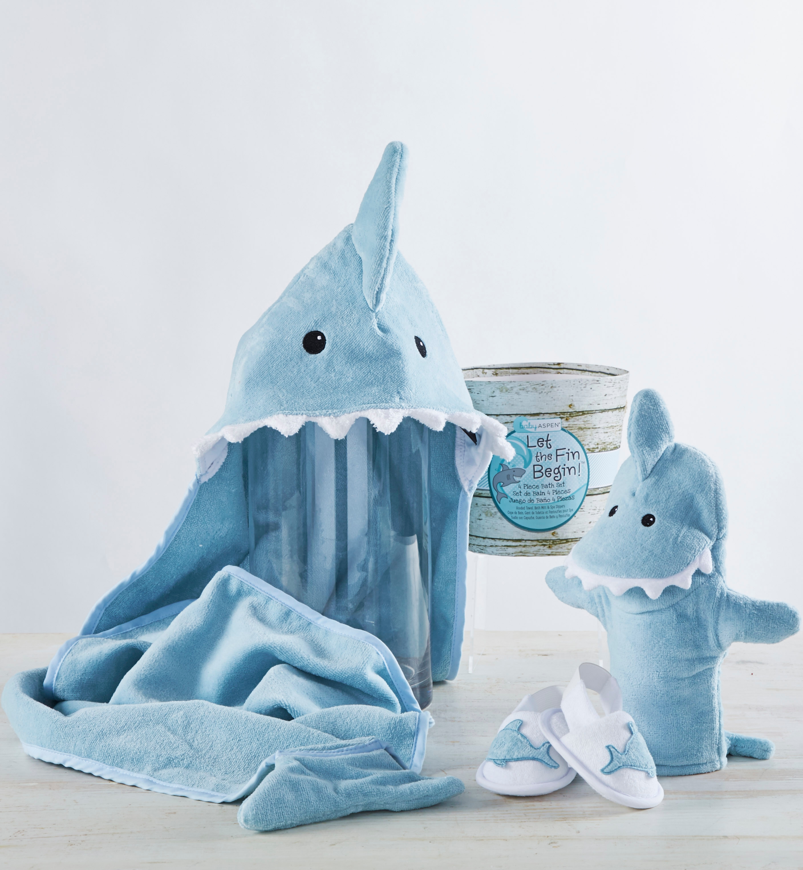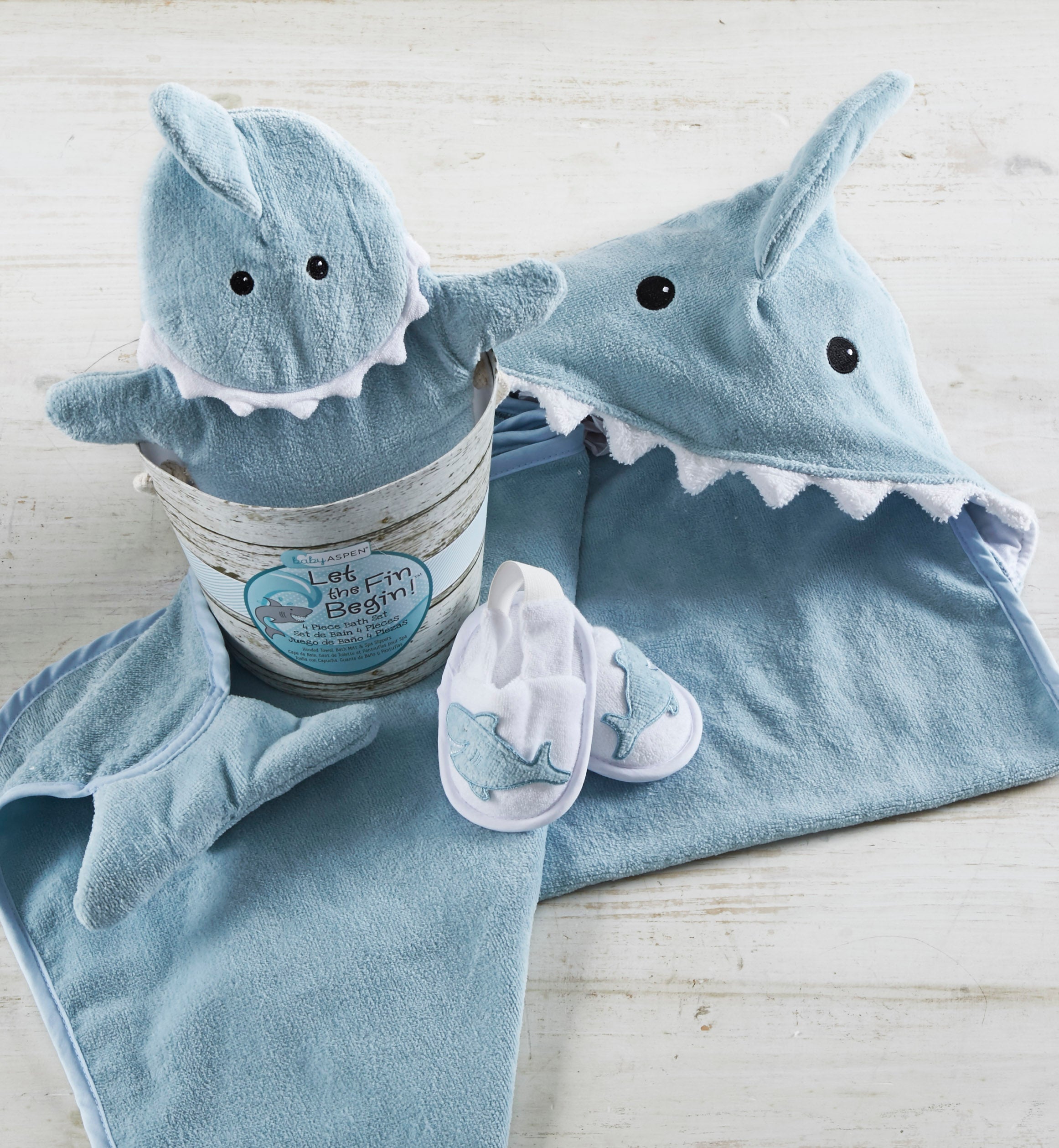 "Let the Fin Begin" bath set is just bursting to the gills with bath time goodies for your little one. Chances are you've never seen a shark this cuddly before. Perfect for bath time or a day at the beach, this is one gift set you will want to reel in.
