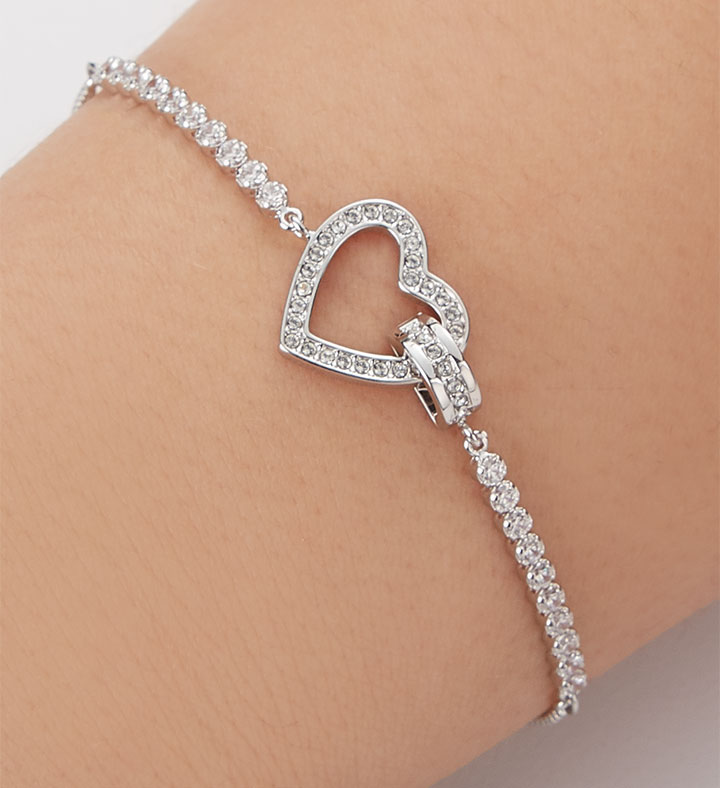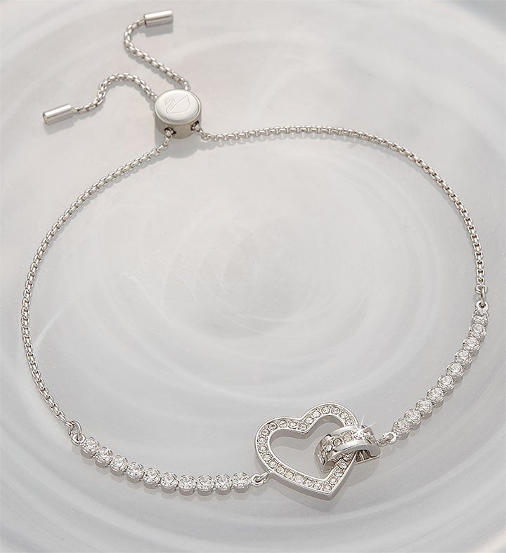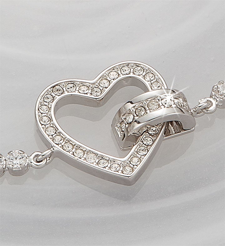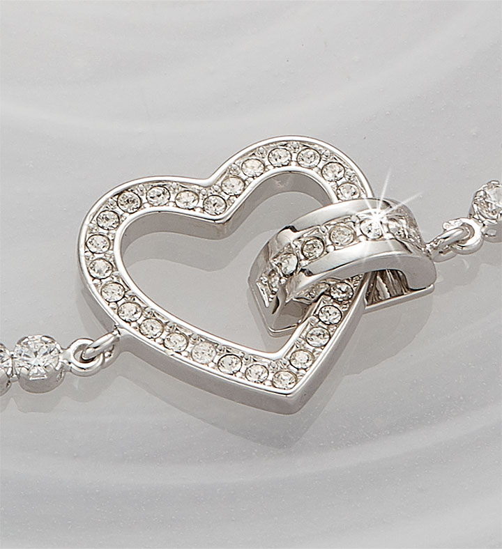 Our gorgeous Swarovski bracelet is simply lovely—just like her. This special keepsake shines with a touch of clear crystal pavé for that unique Swarovski® sparkle. Featuring an interlocking heart and circle motif, it’s a romantic gift that symbolizes the unique bond you share.