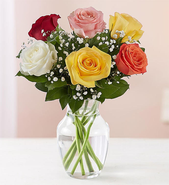 Send a warm embrace with our vibrant roses in all the colors they love. Beautifully arranged by our skilled florists with lush greenery inside an elegant glass vase, six radiant blooms are delivered right to the door to delight them for a special celebration or an out-of-the blue surprise.