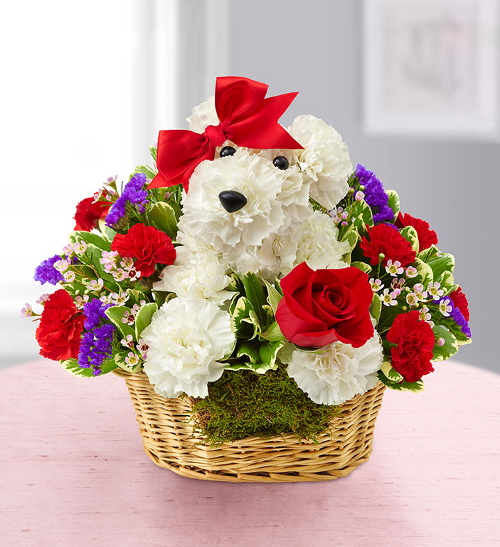 EXCLUSIVE Give them a case of puppy love with our very own Love Pup. Crafted from bright white carnations, our canine cutie arrives in a charming dog bed basket, holding a single red rose. Whether you’re looking to spark a romance or surprise friends, our adorable a-DOG-able® is sure to get tails wagging!