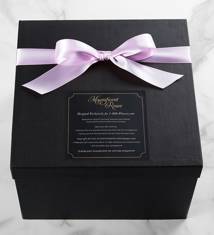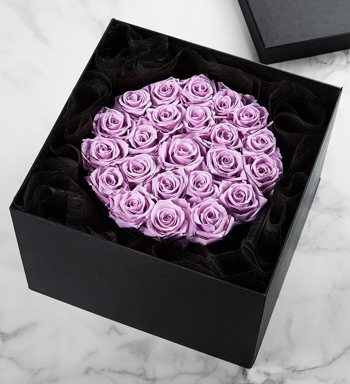 EXCLUSIVE Enchant them with a lasting display of lovely lavender roses. Exclusively designed for 1800Flowers, our genuine lavender roses are selected for their size and perfection, carefully preserved to maintain their exquisite beauty, and artfully arranged in a round, decorative box. It’s a gift of sophistication and luxury meant for one who is truly magnificent!