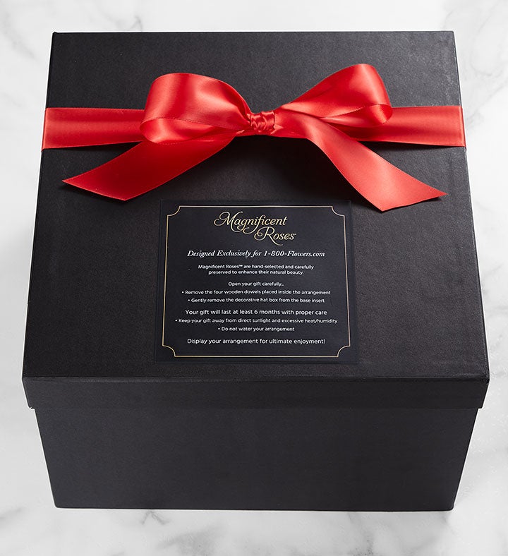 EXCLUSIVE Radiant red roses are the essence of true romance. Exclusively designed for 1800Flowers, our genuine red roses are selected for their size and perfection, carefully preserved to maintain their exquisite beauty, and artfully arranged in a round, decorative box. It’s a gift of sophistication and luxury meant for one who is truly magnificent!