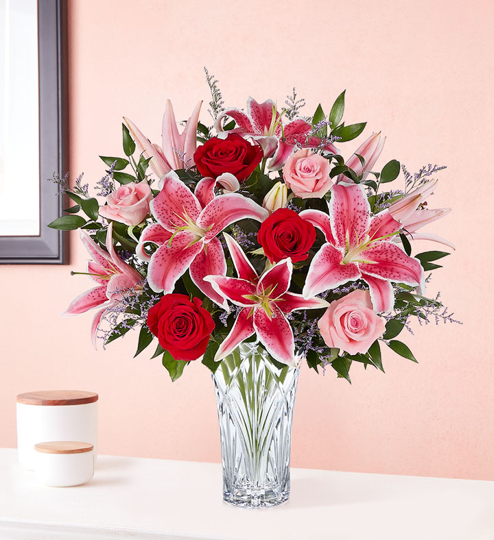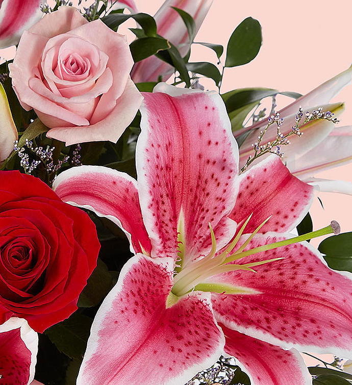 • All-around arrangement with long-stem red roses, pink roses and Stargazer lilies, purple limonium; accented with assorted greenery