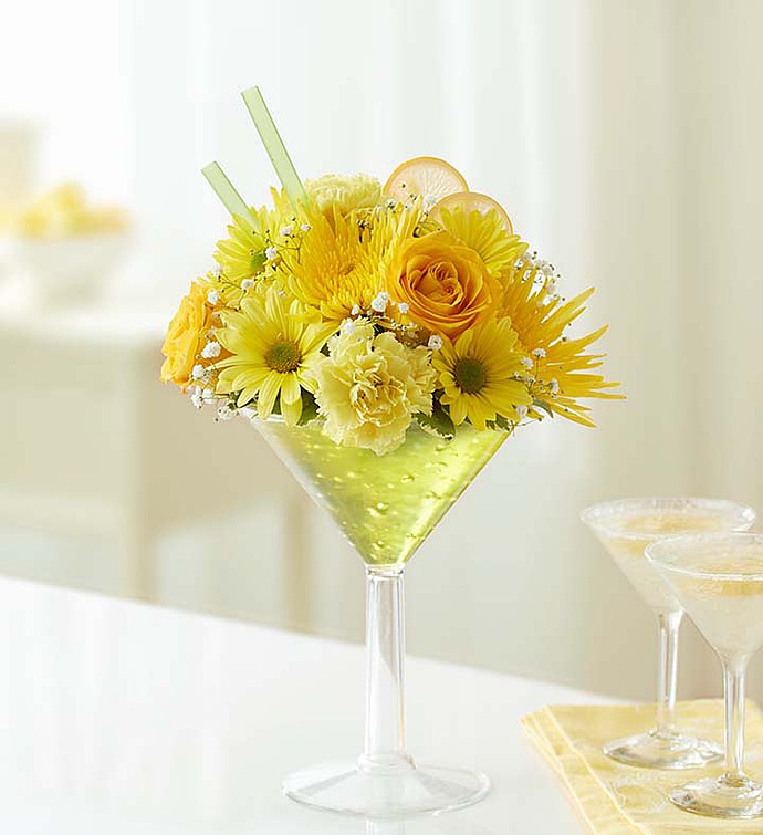 EXCLUSIVE Here’s a bright idea for every celebration… send this truly original cocktail bouquet! Inspired by the famous Lemon Drop martini, our exclusive Happy Hour arrangement is handcrafted inside an oversized martini glass full of cheerful yellow roses, daisies, carnations and more. Topped off with faux lemon slice garnishes, it’s enough to fill their day with sunshine and smiles!