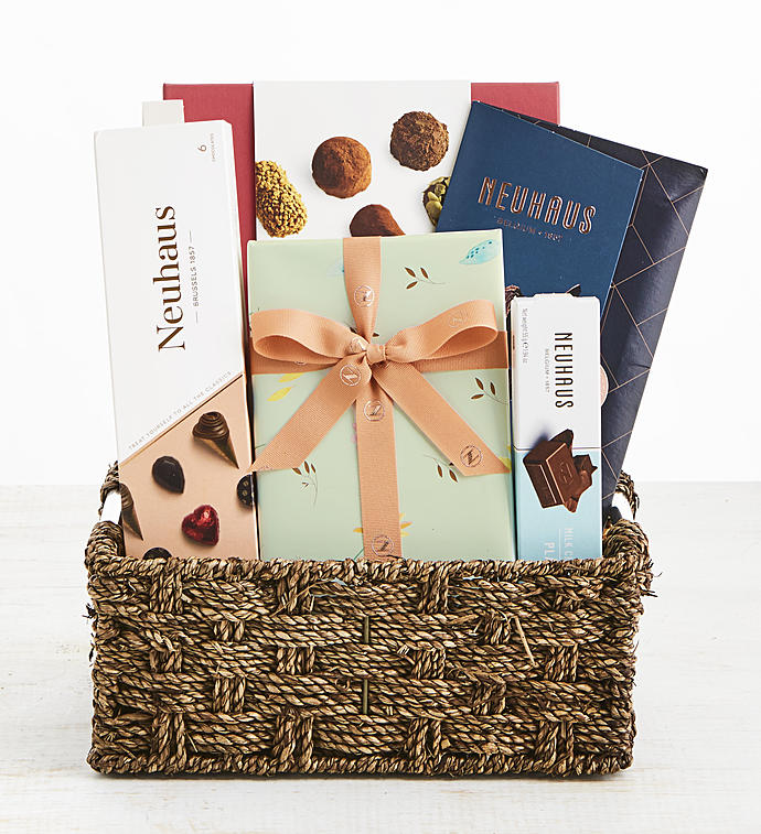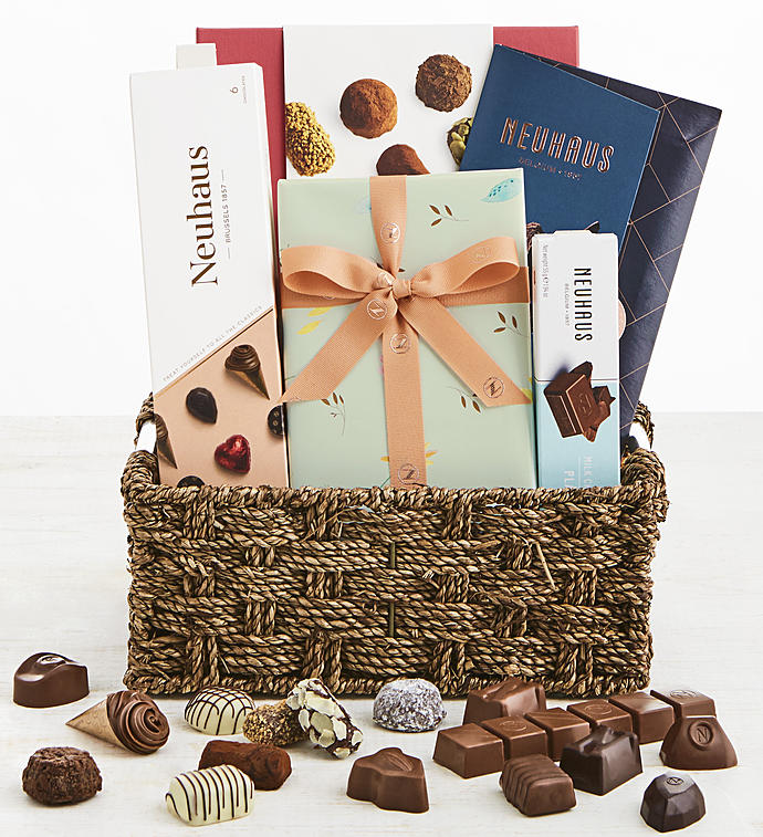 Neuhaus' Chocolatier has created this exquisite Premier Spring Gift Basket exclusively for Simply Chocolate. The ultimate in chocolate decadence, this impressive assortment features the Belgian Master Chocolatier's most popular tastes. Included are a 16-piece assortment of the "World's Best Chocolate Truffles", A six-piece box of pralines in milk, dark and white chocolate, a 17-piece Spring Ballotin gift box, an intense 80% cacao tablet with Ugandan origin dark chocolate and a silky smooth Belgian milk chocolate bar beautifully packed in a lovely artisan craft woven basket.