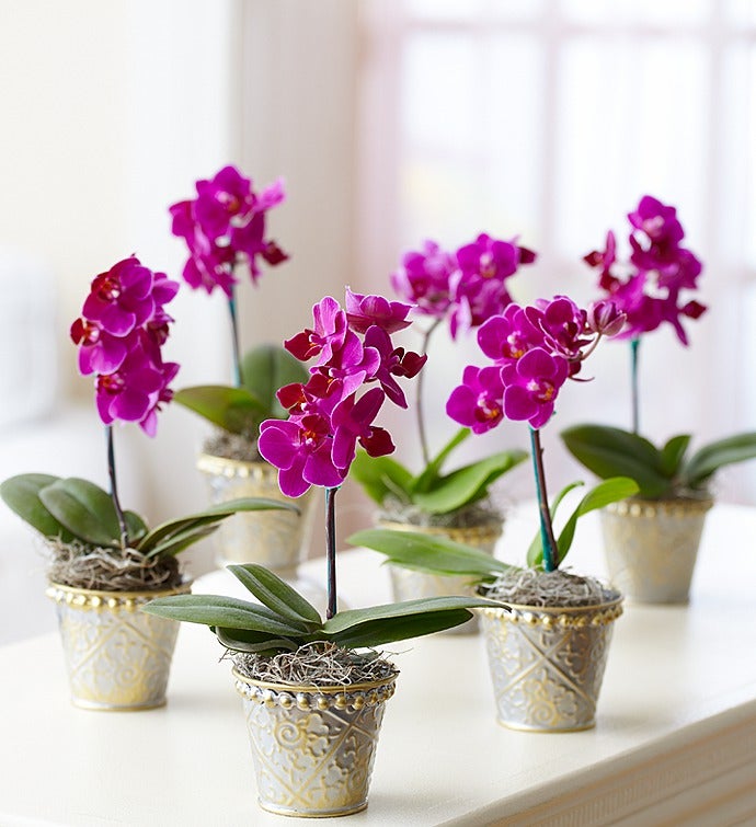 Exotic Phalaenopsis orchids are known as "Moth orchids," because the shapes of their blooms resemble moths in flight. Send certain smiles to someone special with our graceful mini purple Phalaenopsis orchid plant, paired with a stylish silvered planter to add elegance to any setting.