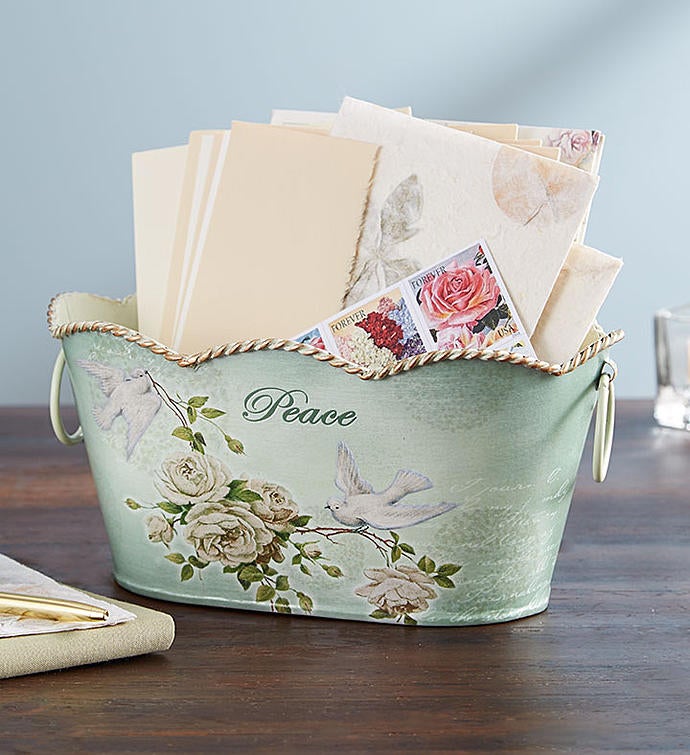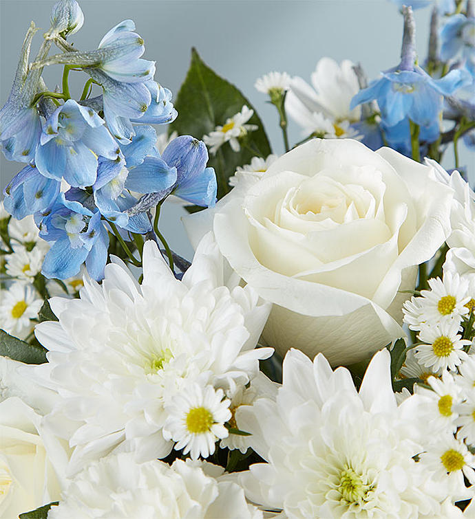 A peaceful bouquet of blue and white can soothe in a time of loss. Our gracefully gathered arrangement arrives set in a decorative oval-shaped planter featuring a dove, the bird of peace, in raised detail on the front. Elegantly inscribed with the word, Peace, it’s a comforting gift makes the perfect gesture of your sympathy.