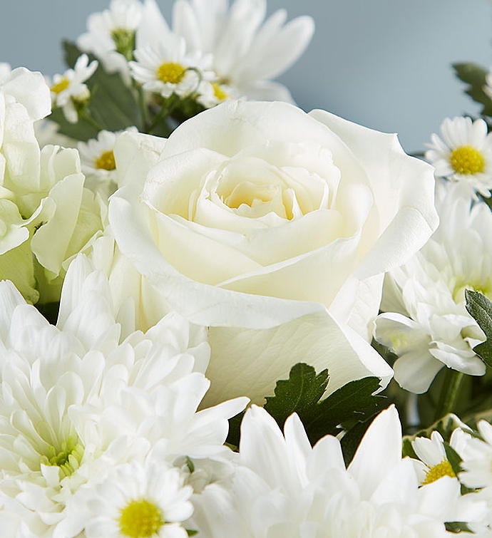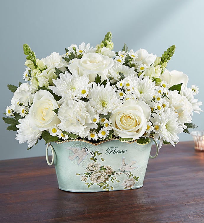 In times of sorrow, a pure white arrangement says all your heart could wish to convey. Our classic bouquet is carefully designed in a decorative oval-shaped planter that features a dove, the bird of peace, and a vintage-inspired floral design. Elegantly inscribed with the word, Peace, it gift makes a beautiful expression of your deepest sympathies.