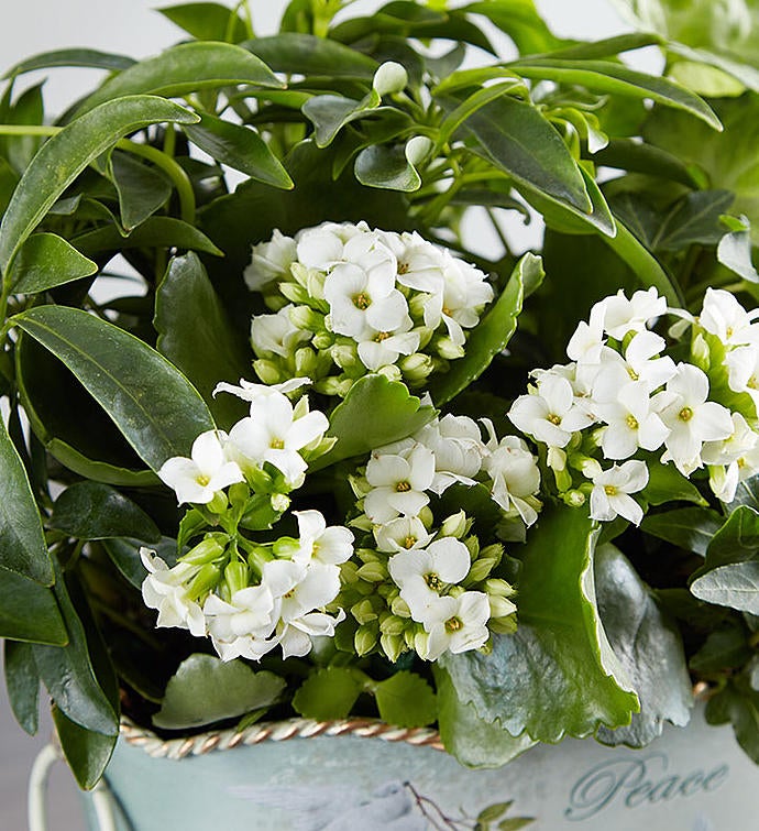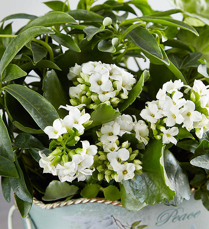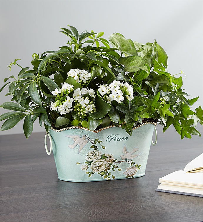 When consoling a loved one, a gift of serene green can provide peace and comfort. Our blooming dish garden is carefully hand-arranged in a decorative oval-shaped planter featuring a dove, the bird of peace, in raised detail on the front. Elegantly inscribed with the word, Peace, it’s a thoughtful gift that makes a beautiful, lasting expression of your sympathy.