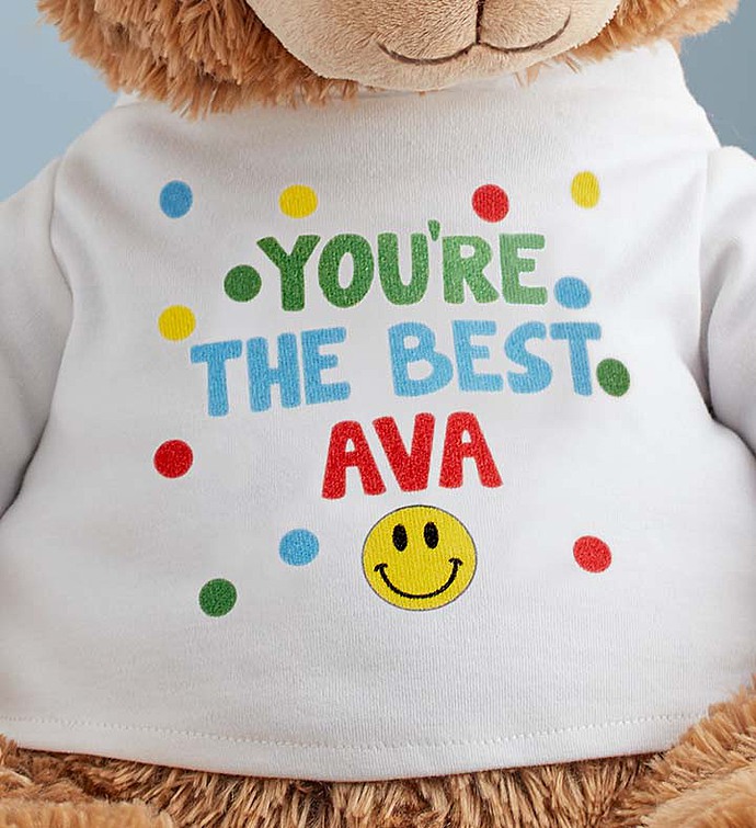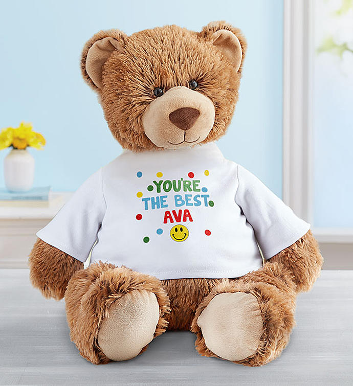EXCLUSIVE Our large, plush bear is a great way to bring out smiles. A new addition to our exclusive Lotsa Love® plush collection, Tommy Teddy arrives wearing a soft, white cotton T-shirt featuring a colorful smiley face graphic that can be customized with a name or personal message.