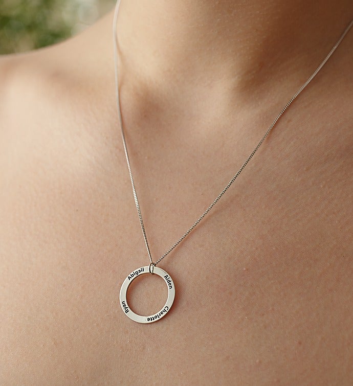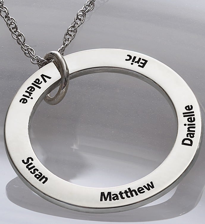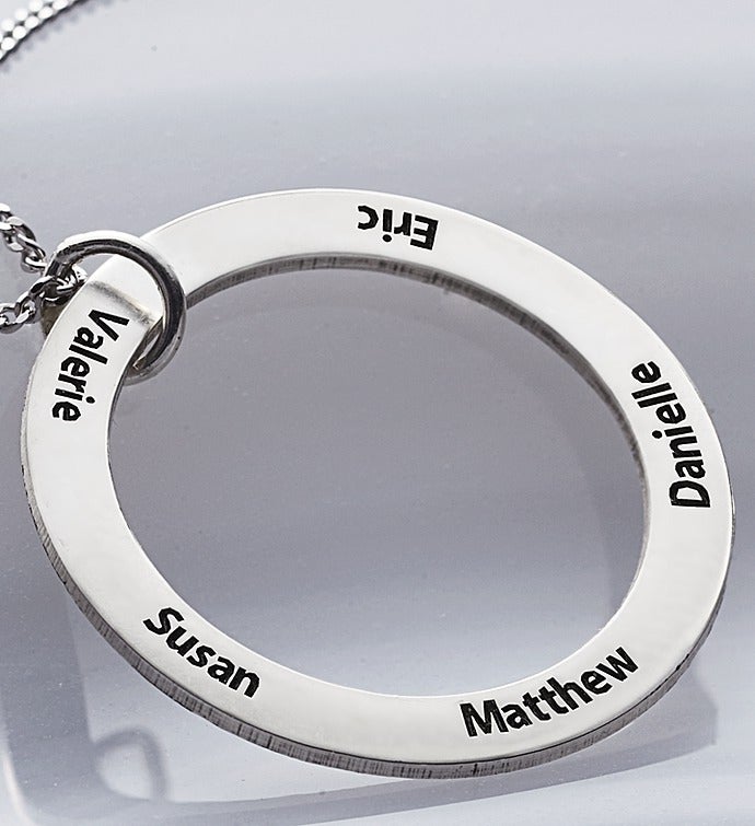 Celebrate those special family members with our unique circle necklace, which represents the unbreakable bonds between parents and children, siblings or any close relationship. Personalize the pendant with up to 5 names to touch their heart and keep them close to yours! It arrives in a hinged keepsake box, making it a one-of-a-kind gift for parents, grandparents or any branches of your family tree.