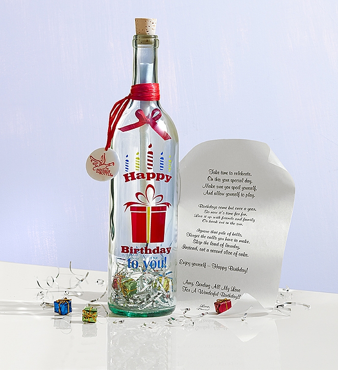 EXCLUSIVE Send a unique and memorable birthday greeting from the heart that’s sure to touch theirs. Our keepsake Message in a Bottle® arrives with your best birthday wishes printed on a scroll inside. It’s a touching gift to let someone know they’re on your mind, not only on their birthday but every day. To sweeten their surprise, we’ve included a delicious box of candy and a festive balloon!