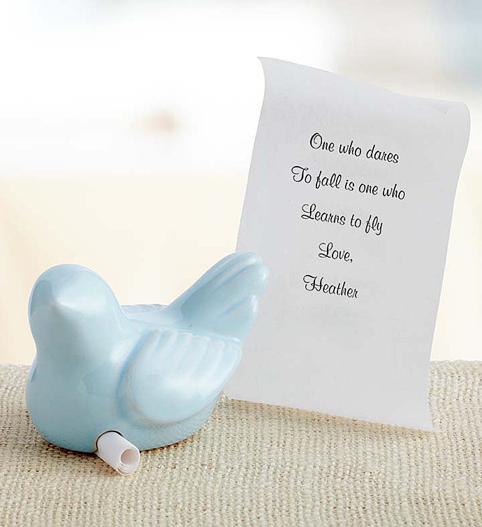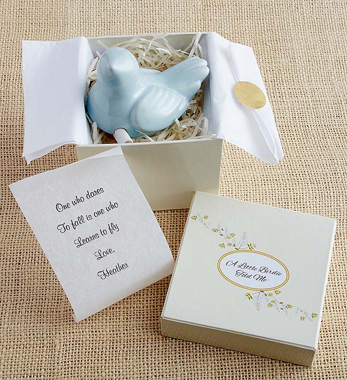 EXCLUSIVE Our charming messenger bird will transport your personalized sentiments into the hands and heart of someone you care about. Beautifully crafted from a rich polished stone, this enchanting blue bird will perch somewhere special in their home, carrying your affectionate words as a constant reminder of how you feel. Adding to its delight, our messenger bird arrives in a delicate straw nest to hold your message close, and is placed in a decorative box with the signature note: “A Little Birdie Told Me”. A unique gift idea both for important occasions or life’s just because moments, this treasured keepsake beautifully conveys any message with pleasure.