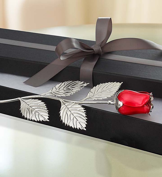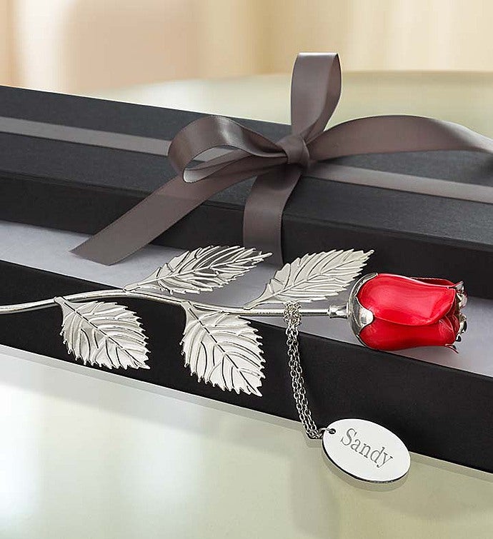 Our elegant personalized rose is a unique and lasting expression of love. “This gift was inspired by the brightly-colored painted enamels sold in the quaint gift shops of the Piazza San Marco in Venice,” says Valerie from our Product Development team. It comes with a metal hangtag, which you can choose to have engraved with a custom name or message, creating a beautiful keepsake they’ll cherish forever.