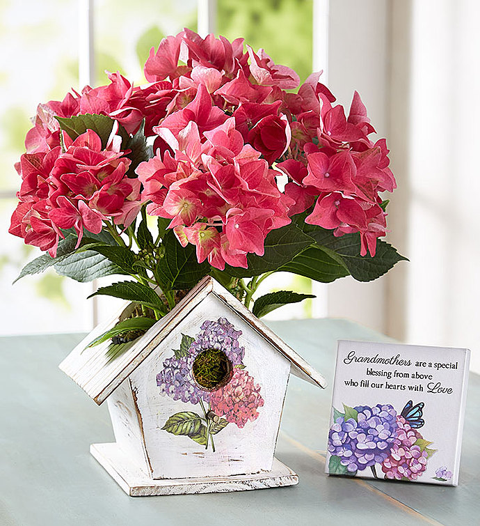 A little birdie told us she’d love this Mother’s Day surprise! Our wooden birdhouse planter is decorated with a watercolor hydrangea design and paired with a blooming pink hydrangea. Cheerful and bright, it’s the perfect display for her home or garden. Complete your gift by adding a delightful keepsake plaque with a sweet sentiment for Mom or Grandma.