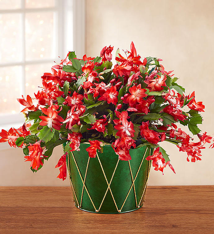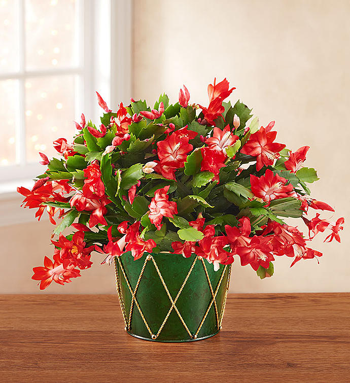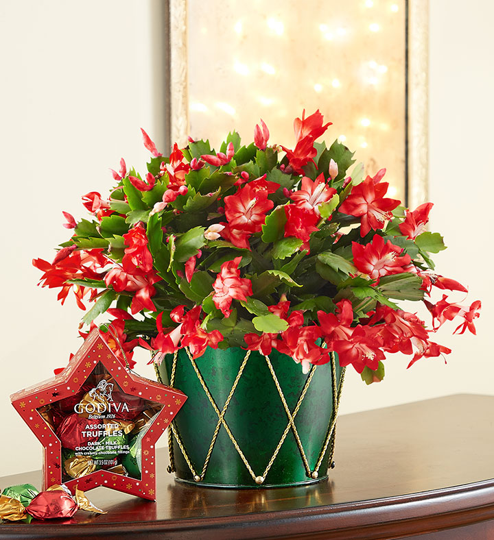 EXCLUSIVE Drum up holiday spirit with our festive Christmas Cactus. Arriving inside a green and gold tin drum planter, our succulent plant, available in large or small, displays its cheerful blooms. Re-use the decorative drum to hold pinecones, holiday cards, or other small décor items. To make it even more merry, add our decadent Godiva® chocolates in a festive star-shaped gift box.