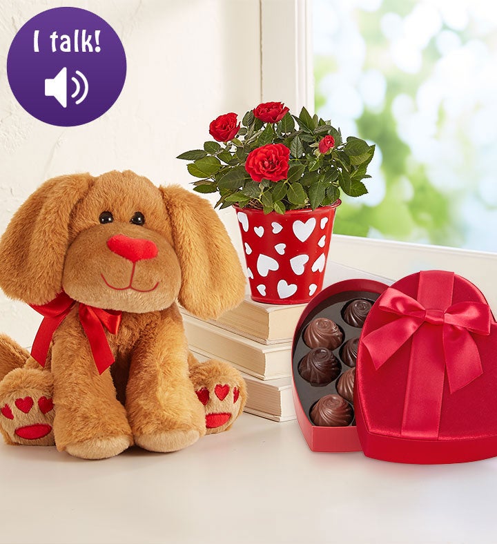 EXCLUSIVE Valentines of all ages will love cuddling up with our plush pup, Heart Throb™, part of our Lotsa Love collection. Sporting an adorable heart-shaped nose and heart-print paws, he arrives with our charming mini red rose plant designed in a matching heart planter. It’s the perfect pairing of cuddly and classic.