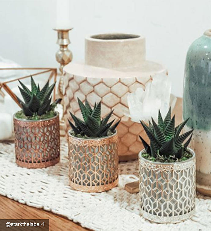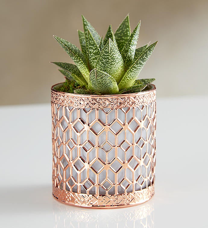Our striking new mini succulent trio proves that good things come in threes. Each little succulent comes inside a sleek metallic votive holder—yellow gold, rose gold and bronze. Known for being long-lasting and low-maintenance, this set of succulents makes a cool and creative gift for anyone looking to spruce up their space.