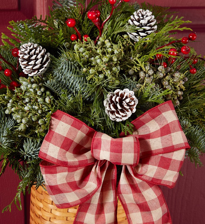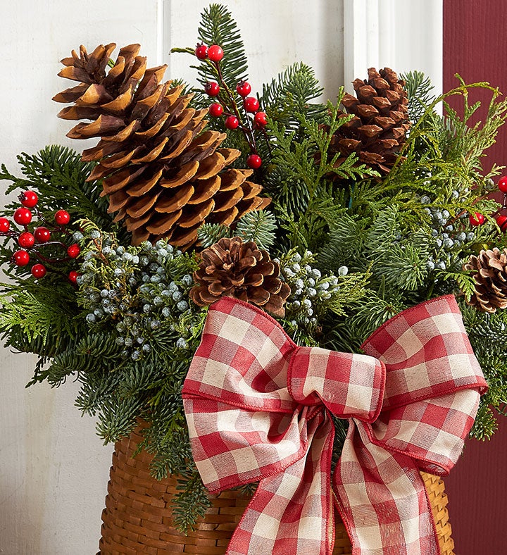 Bring southern charm to your winter décor with our rustic evergreen basket. Designed in exclusive partnership with Southern Living, our gathering of fresh, fragrant greenery is accented with rustic pinecones and red berries. Available in large or small, it’s set in a flat-bottom, woven wicker basket adorned with a plaid ribbon. What a delightful way to welcome guests to your home this season.