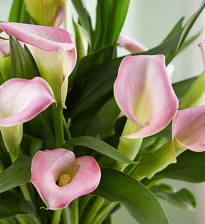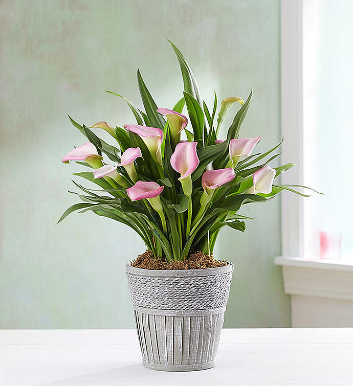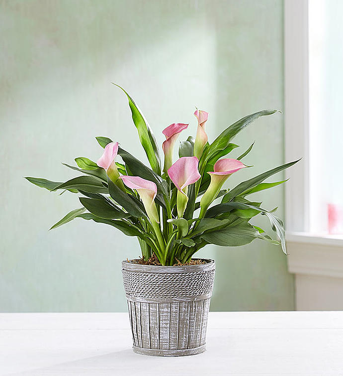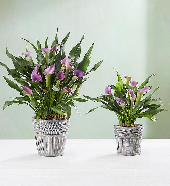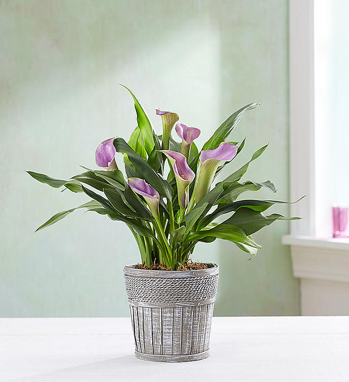 Bursting with vibrant pink or purple blooms, our fresh Calla lily plant paints a picture of elegance and grace, especially when paired with a chic grey washed wooden planter. Whatever your reason for sending this charming gift, it’s expressive beauty is sure to brighten someone special’s day.