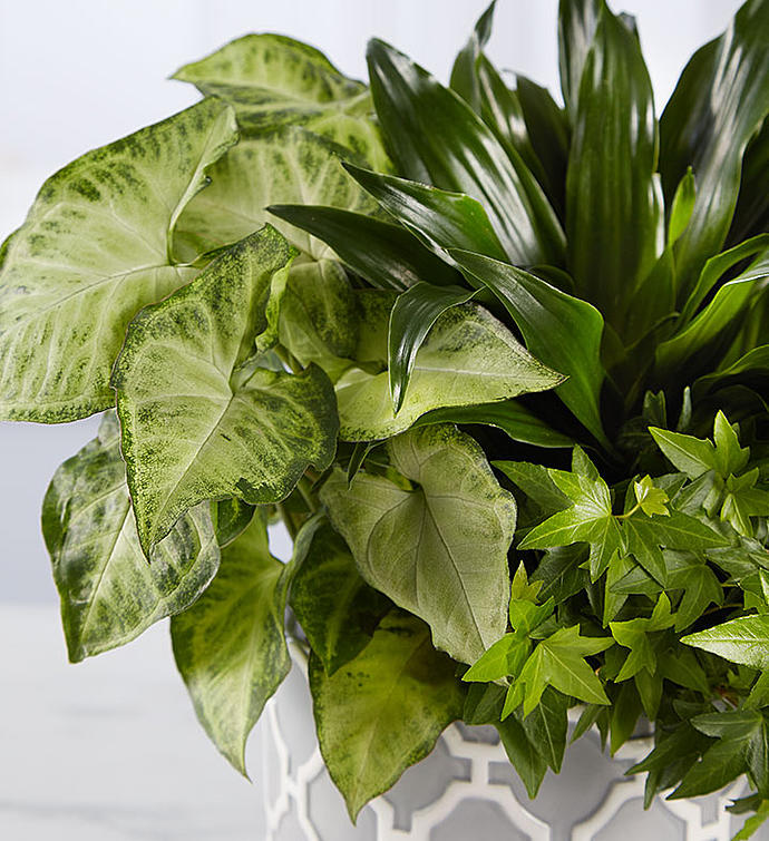 EXCLUSIVE Offer comfort and support with a peaceful and lasting gift. Created exclusively through our partnership with Real Simple, this lush dish garden is hand-arranged with an assortment of green plants inside our geometric cylinder vase. Accented in soft gray and white, this soothing design makes a touching expression of your condolences.