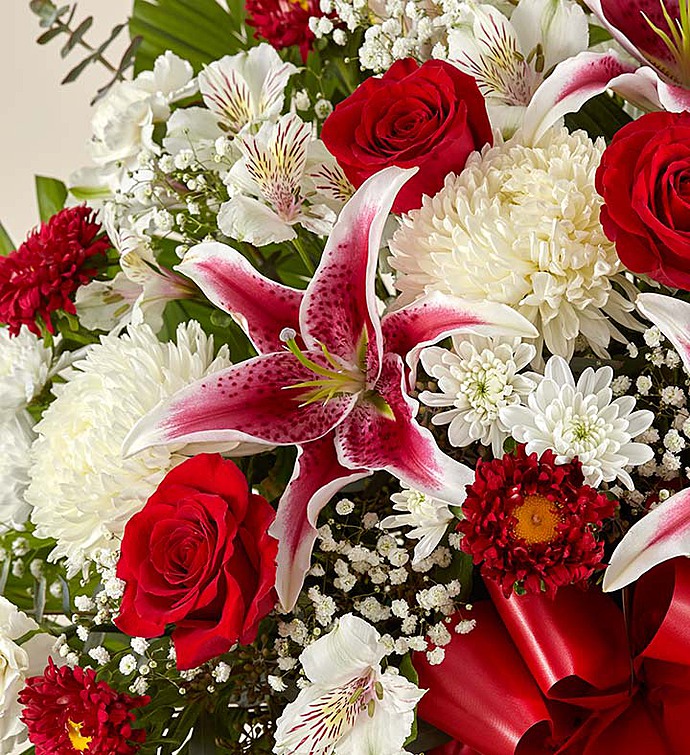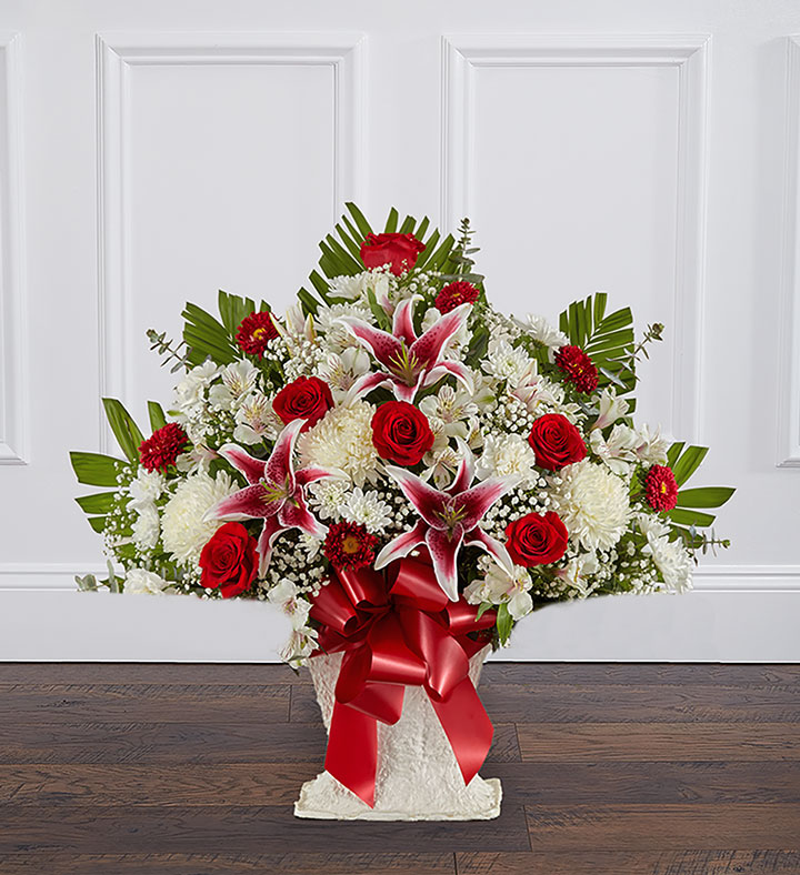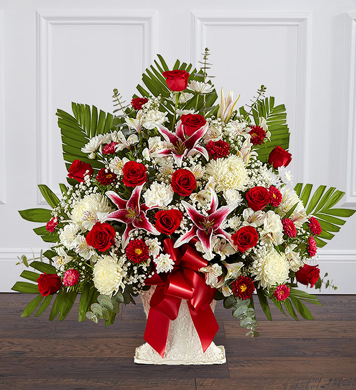 Our timeless and regal sympathy floor basket beautifully says what words cannot express. Deep ruby red roses and stunning Stargazer lilies form an elegant feature among the soft white mums and carnations, reflecting heartfelt sympathy.