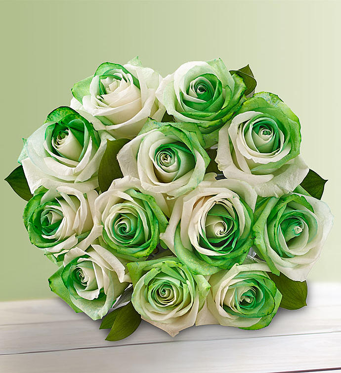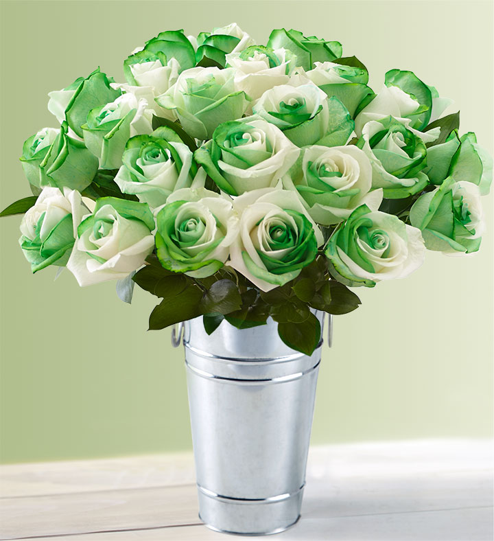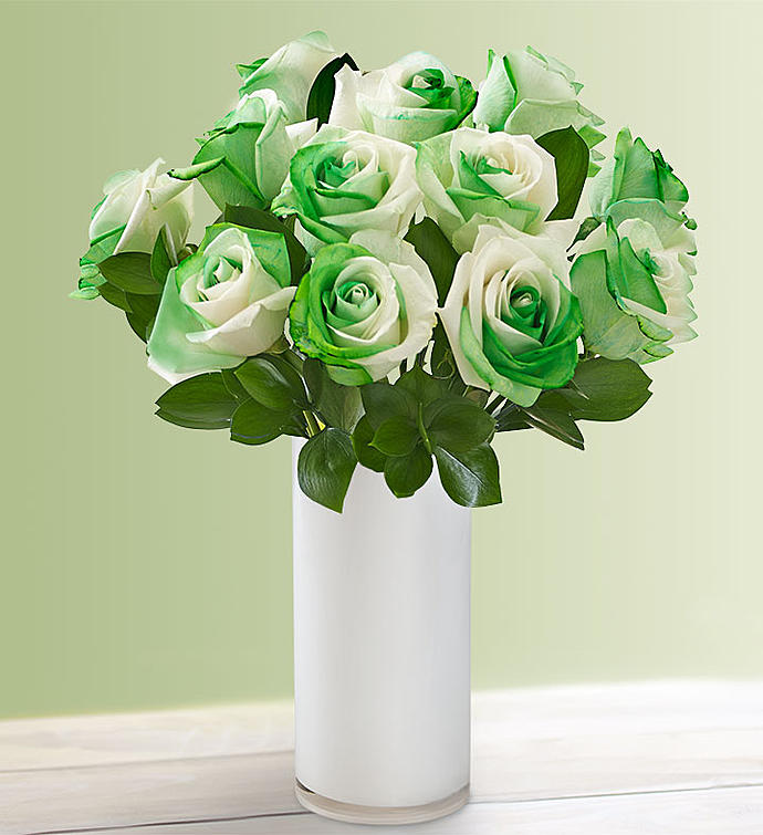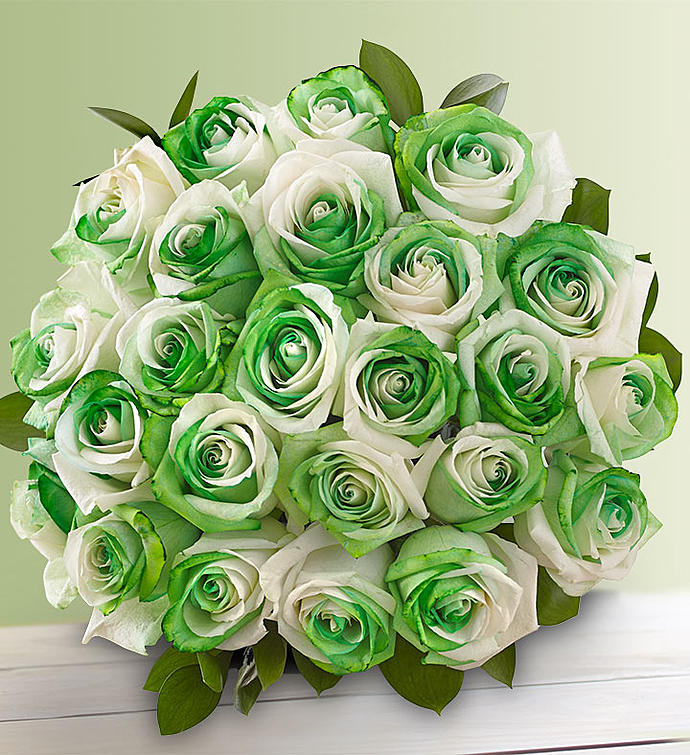 Our St. Paddy’s Day roses will have Irish eyes smiling. Each bloom is color-enhanced on our floral farms with its own unique mix of green & white, so that no two are exactly alike. What a fun gift to celebrate St. Patrick’s Day, March birthdays or their proud Irish heritage.